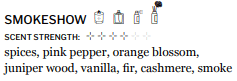 But Smokeshow doesn’t stop there. Just when you think it’s all forest and fire, it wraps you up in smooth cashmere and vanilla—subtle, skin-close, and undeniably magnetic. The finish is soft smoke: cozy, intimate, and a little wild around the edges. It doesn’t try too hard. It just is.