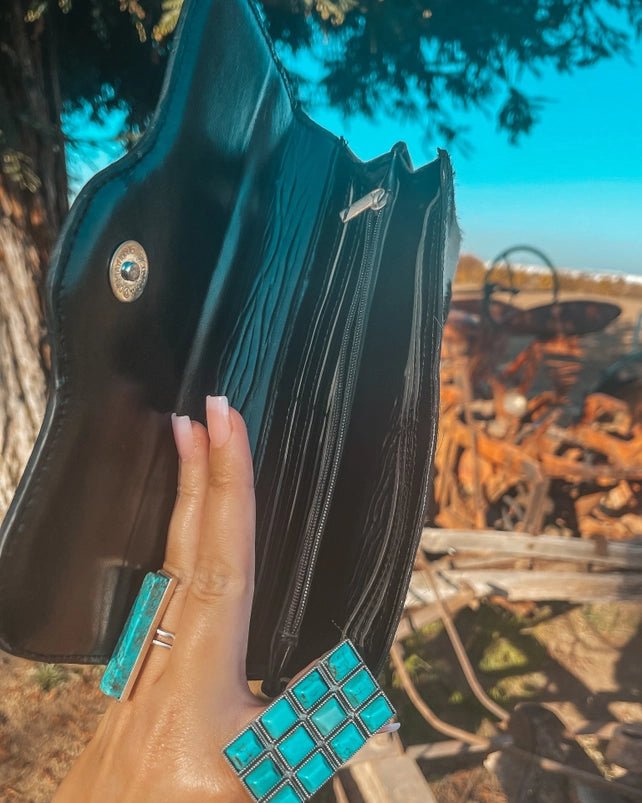 The Jessie Jane Hide and Tooled Wallet in Black by Haute Southern Hyde is a striking blend of bold western tooling and natural texture. Featuring beautifully detailed tooled leather across the front and genuine hide throughout, this wallet delivers a high-end look with true one-of-a-kind character. The black leather interior adds a sleek contrast, making this piece both timeless and eye-catching.