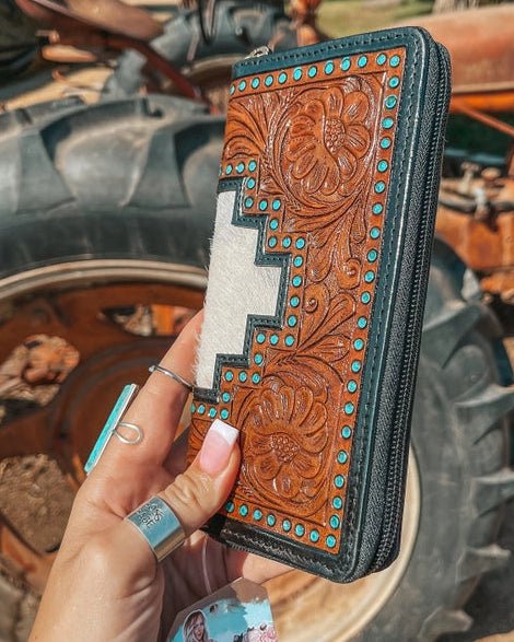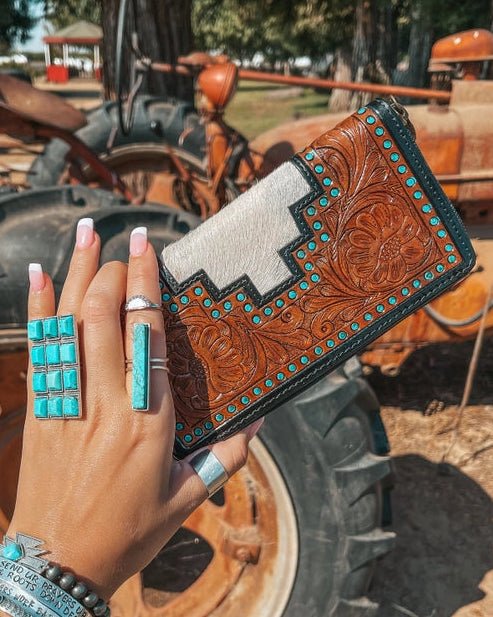 The Cheyenne Hide and Tooled Wallet is a standout piece that captures everything you love about bold western style. Featuring beautifully tooled leather framed with a striking black border and accented with turquoise stud details, this wallet delivers a perfect balance of rugged texture and eye-catching design. The genuine hide inlay adds depth and character, making each piece completely one of a kind.