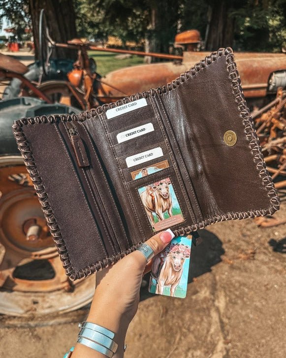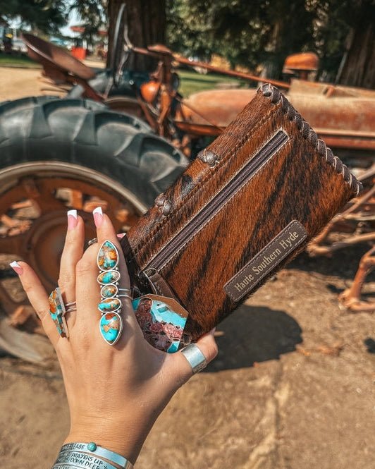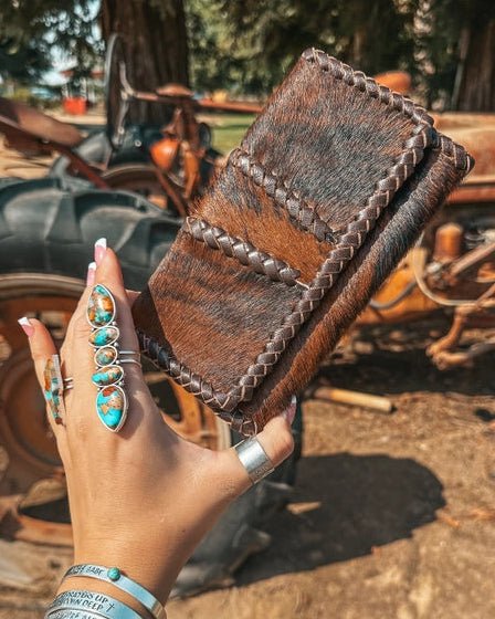 The Hazy Full Ryder Hide Wallet in Brown by Haute Southern Hyde is the perfect blend of simplicity and western texture. Crafted from genuine hide with hand woven leather detailing, this wallet delivers a natural, effortless look that stands out without trying too hard. The rich brown tones and unique hide pattern make every piece one of a kind, adding character you won’t find in mass-produced accessories.