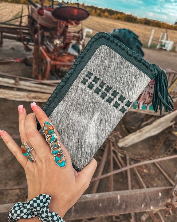 The Hazy Wesson Hide Wallet in Black by Haute Southern Hyde brings together bold contrast and clean western design in one standout piece. Crafted from genuine hide, this wallet features a striking natural pattern paired with sleek black leather trim and detailed stitching for a refined finish. The braided edging and subtle western accents give it just the right amount of edge while keeping the overall look versatile and easy to carry.