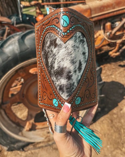 The Heart Throb Hide Wallet by Haute Southern Hyde is the perfect blend of western charm and heartfelt detail. Featuring a beautifully tooled leather exterior with a standout heart-shaped hide inlay, this wallet brings a unique and meaningful touch to your everyday essentials. The turquoise accents and intricate tooling add just the right amount of color and character, making it a true statement piece.