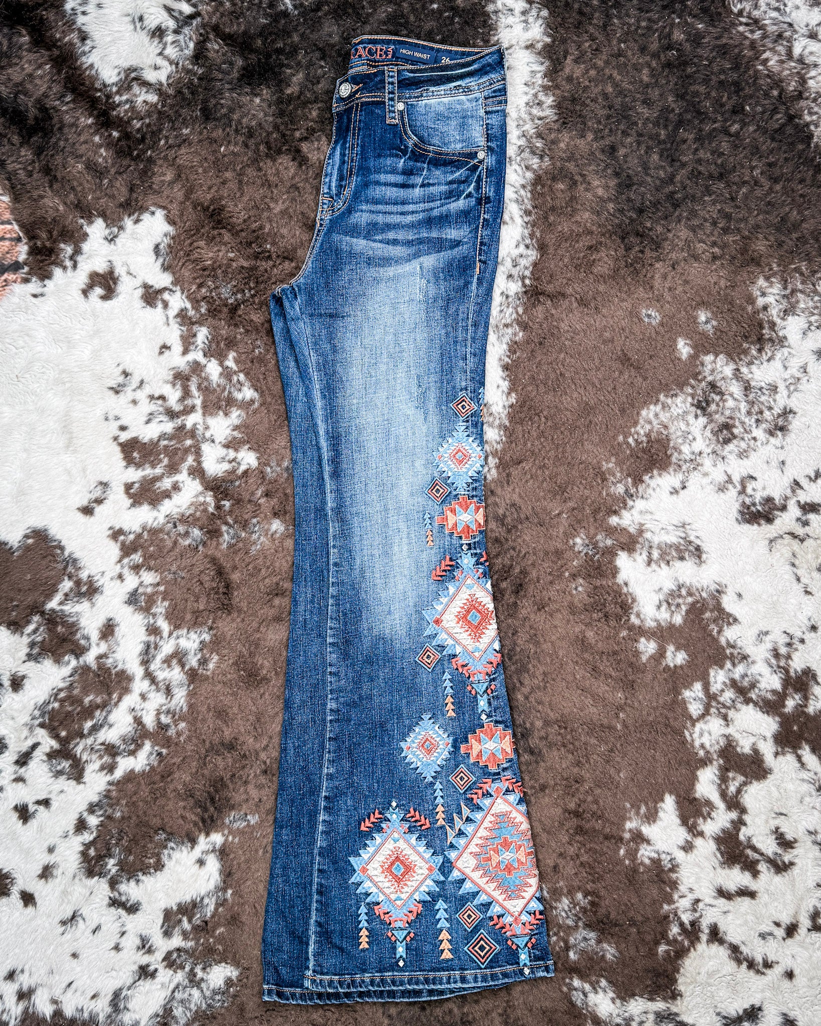 Bring a bold boutique edge to your everyday denim lineup with these Grace in LA Easy Fit flare jeans. Designed in a flattering high rise and finished in a rich medium dark blue wash, this pair blends comfort with standout western-inspired detail. The leg features vibrant Aztec embroidery in warm earthy tones and soft turquoise accents, creating a striking boho look that feels elevated and wearable.