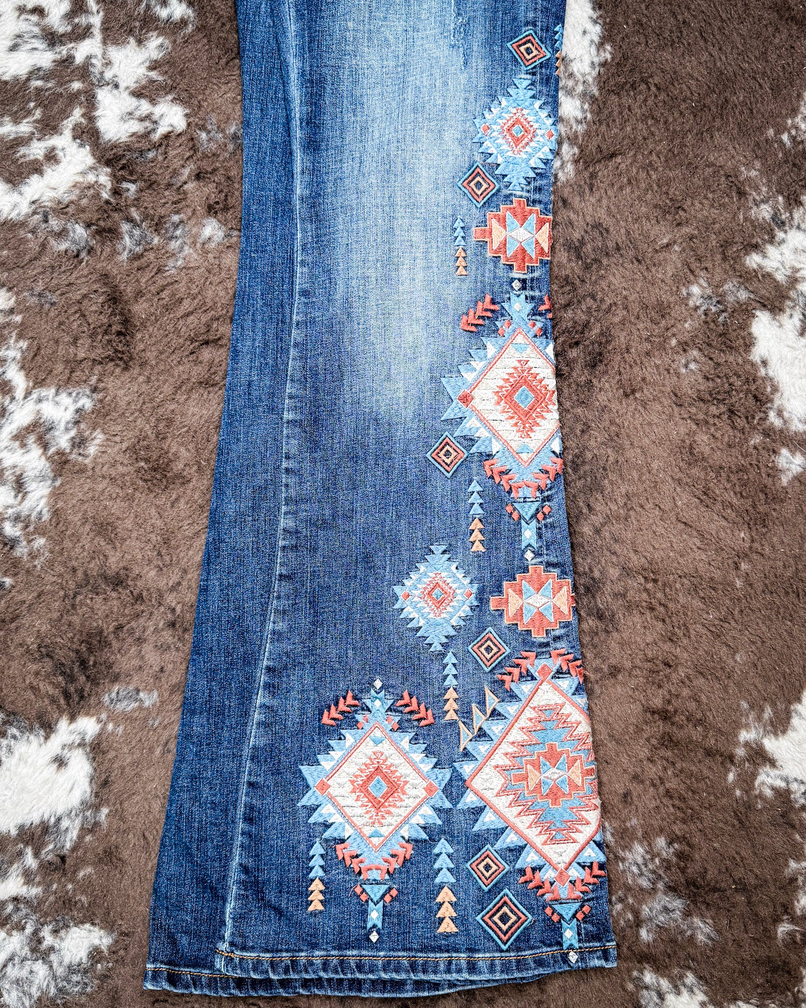 - Colorful Aztec embroidery down the leg