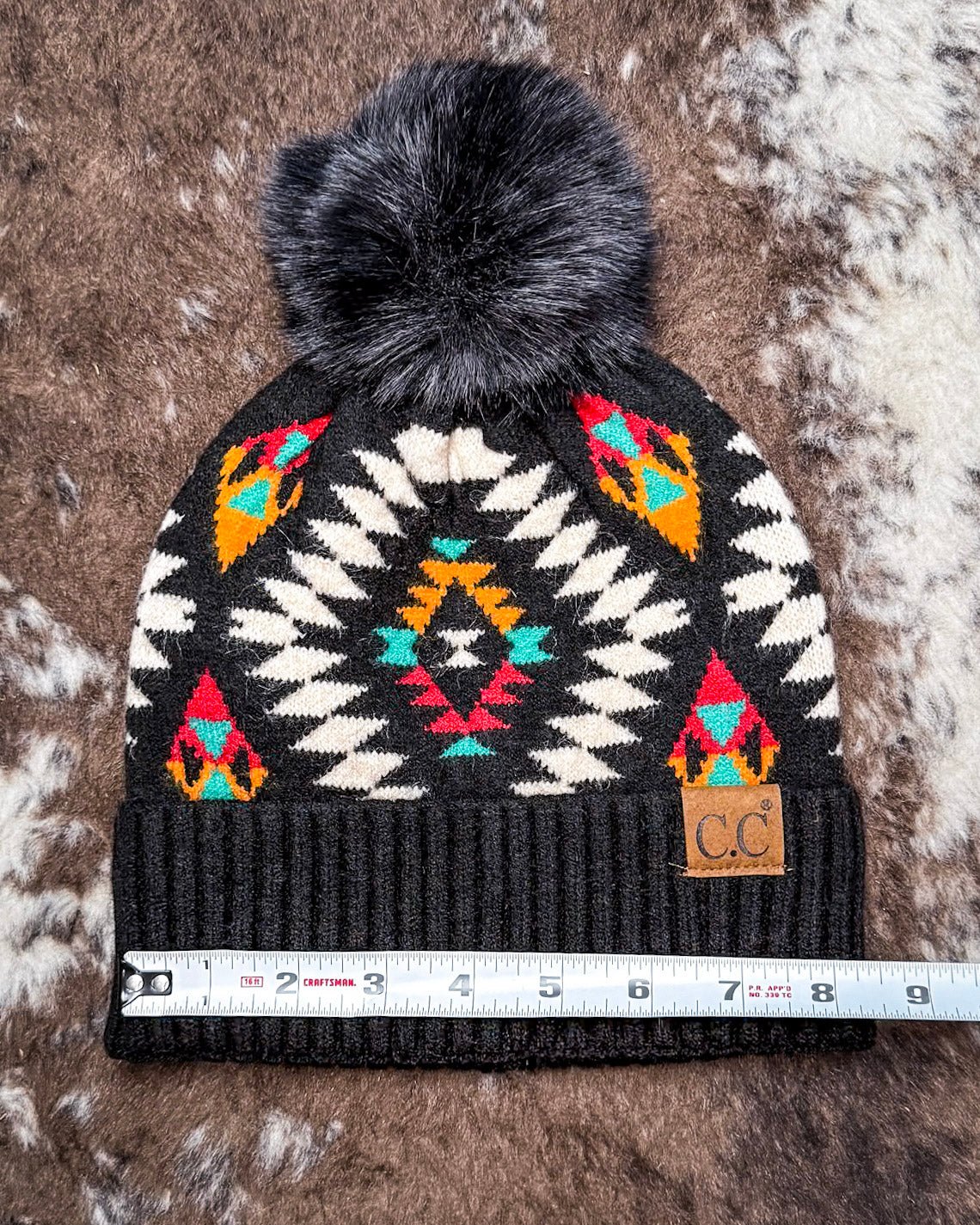 The deep black base makes the colorful Aztec-inspired pattern pop, with vibrant red, turquoise, and gold details bringing that western flair. Topped with a soft black faux fur pom, this beanie is both warm and statement-making.