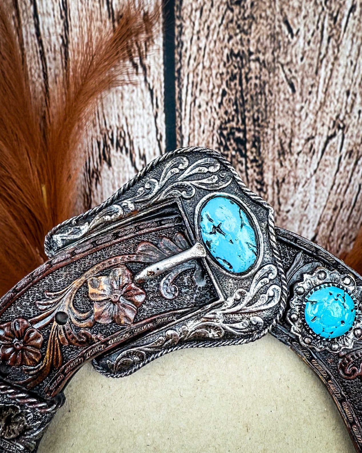 Add a bold Western flair to your home or office décor with the Tough 1 Belt Buckle Oval Picture Frame. Crafted in the shape of a stylized belt, this unique resin frame features detailed floral tooling and is adorned with faux turquoise conchos for a pop of Southwestern charm. A sculpted buckle, keeper, and tip complete the authentic belt look.