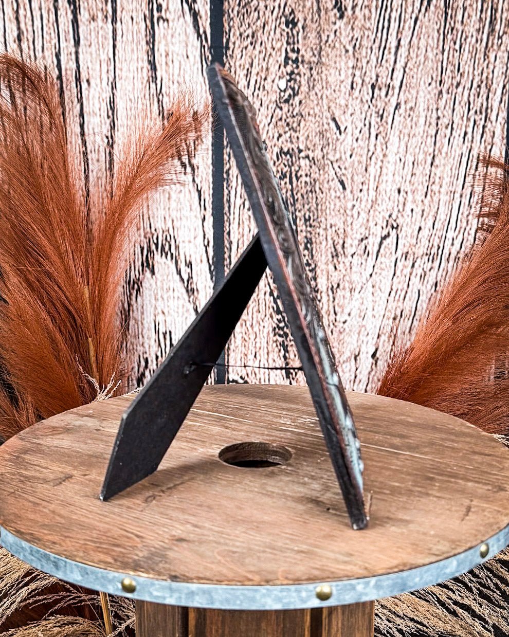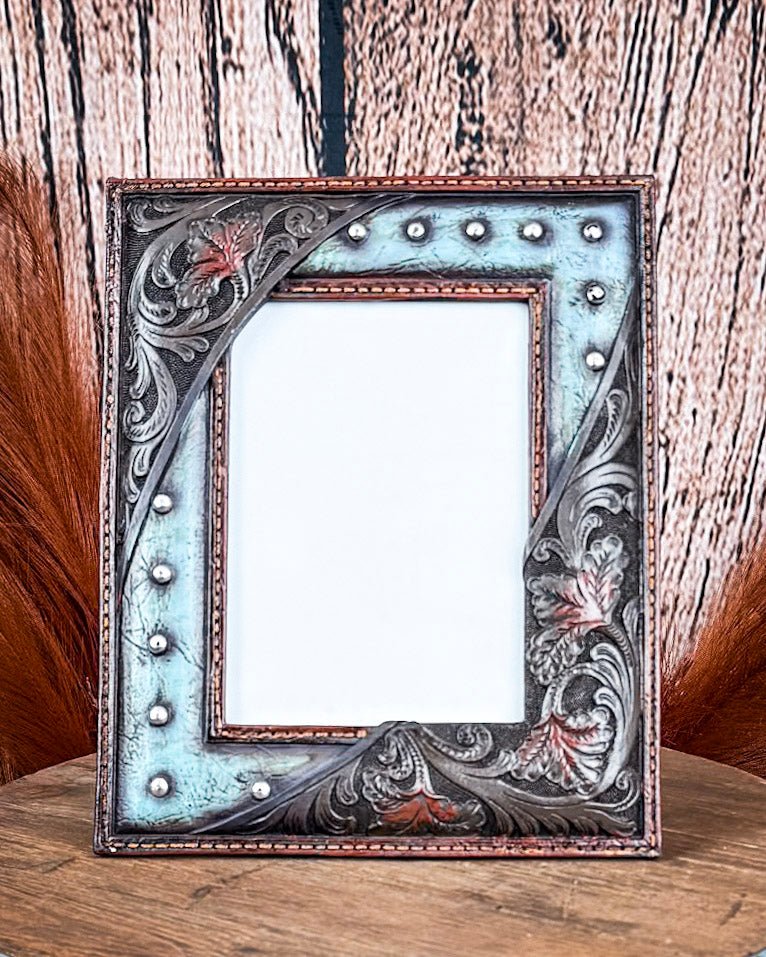 Bring Western elegance to your space with the Tough 1 Leather with Studs Picture Frame. Featuring a rustic turquoise background, this frame is highlighted by detailed tooled leather-look corners and bold silver stud accents for a striking finish. Perfect for showcasing your favorite photo with a touch of western flair.