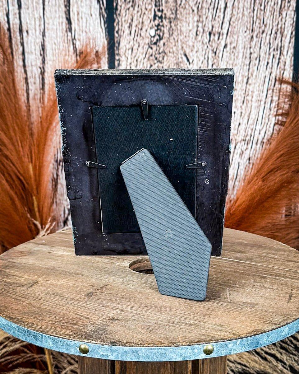 Add a refined Western touch to your décor with the Tough 1 Turquoise and Silver Picture Frame. This stunning resin frame mimics the look of distressed turquoise leather and features embossed looking silver painted floral corner plates with intricate engraving. Detailed stitching completes the authentic Western vibe.