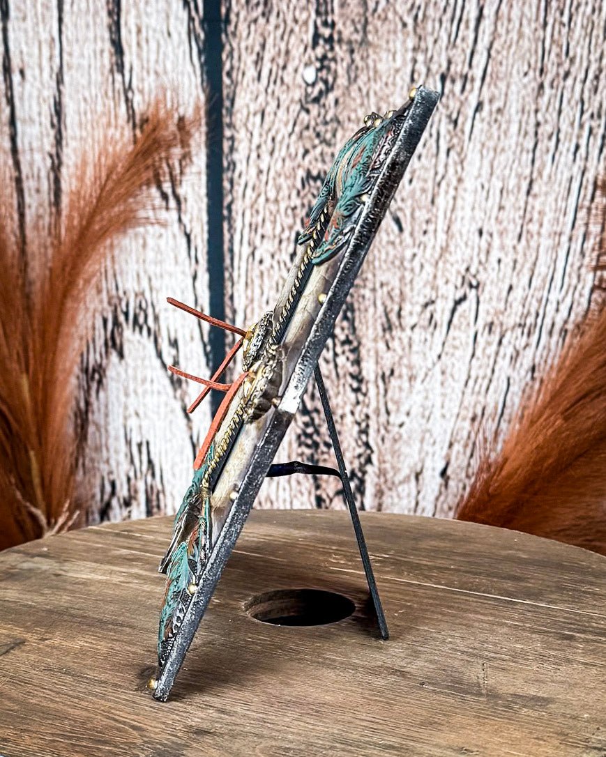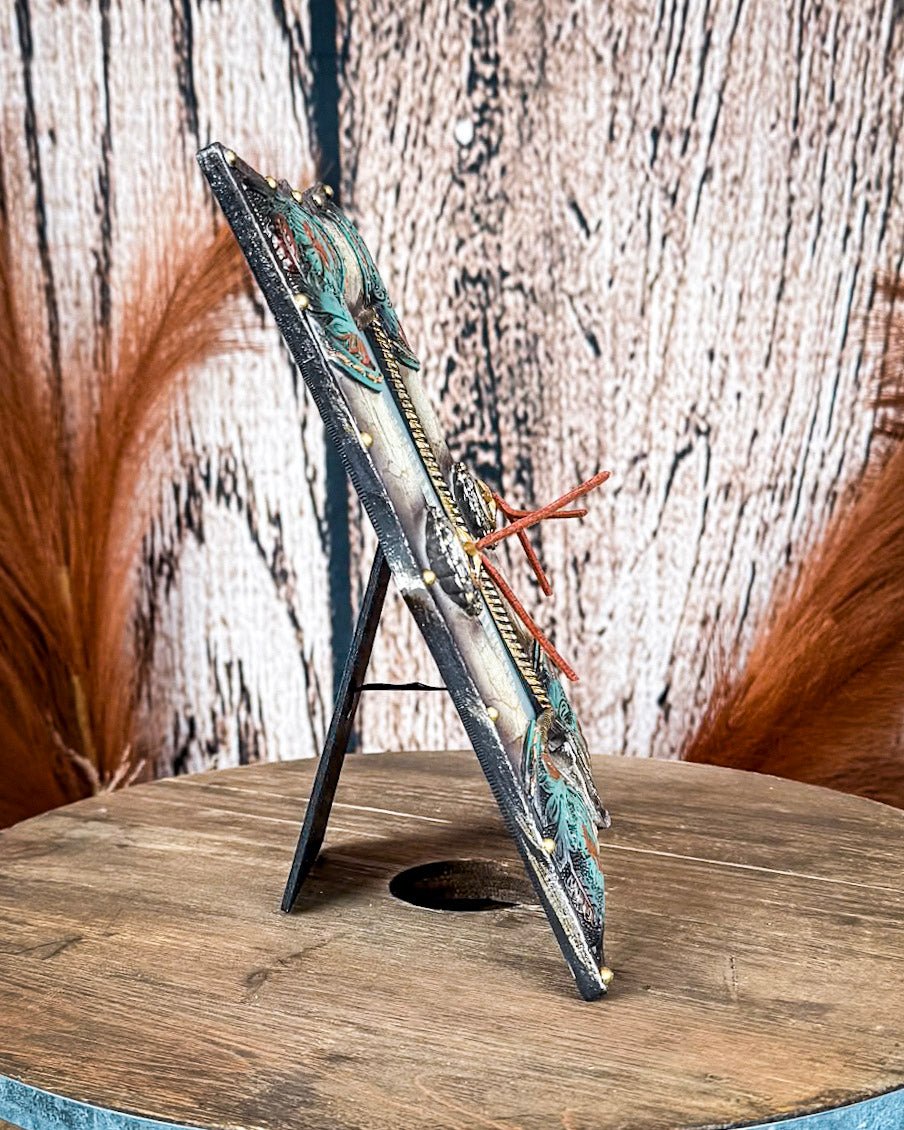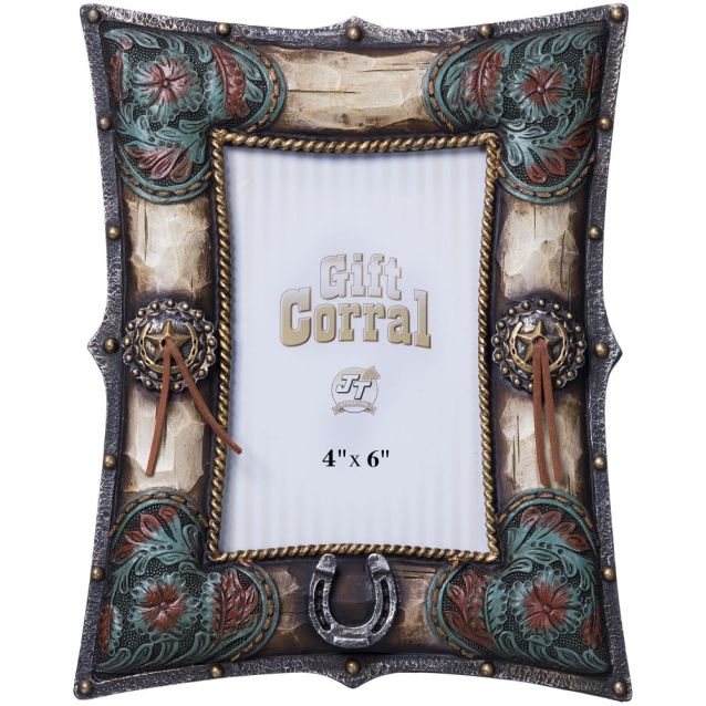 Infuse your space with rustic Western charm using the Tough 1 Turquoise Floral Picture Frame. Designed with a weathered birch wood look, this resin frame is accented by ornate turquoise floral tooling in each corner, silver star conchos with leather tassel accents, and a silver horseshoe at the base. A twisted rope-style trim surrounds the photo opening, adding depth and texture.
