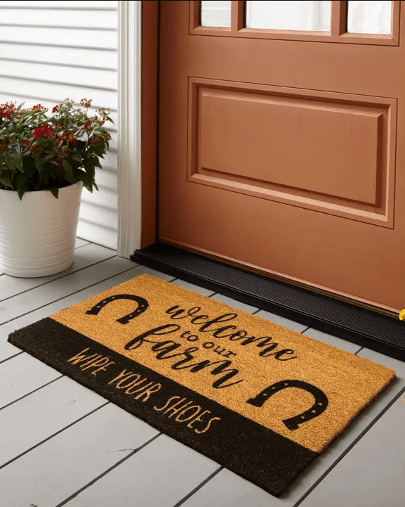 The design strikes that perfect balance between cute and classic. “Welcome to our farm” is written in a farmhouse-style script, flanked by two horseshoes (always pointing up, for good luck). Below that, the bold “Wipe Your Shoes” line gets straight to the point—because you know someone in the house just mopped the floor.