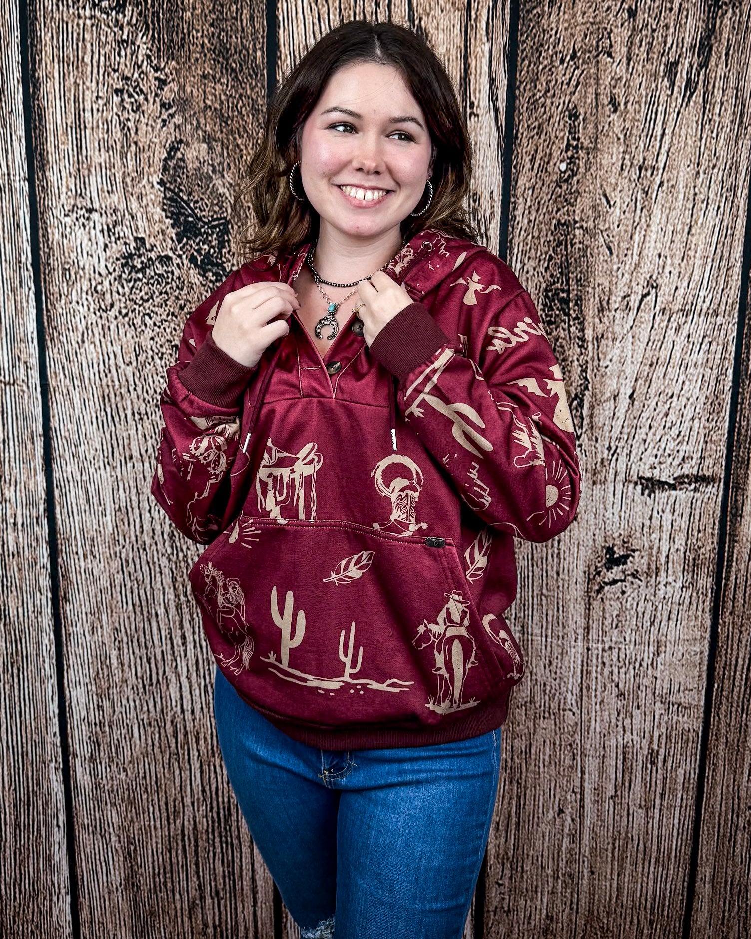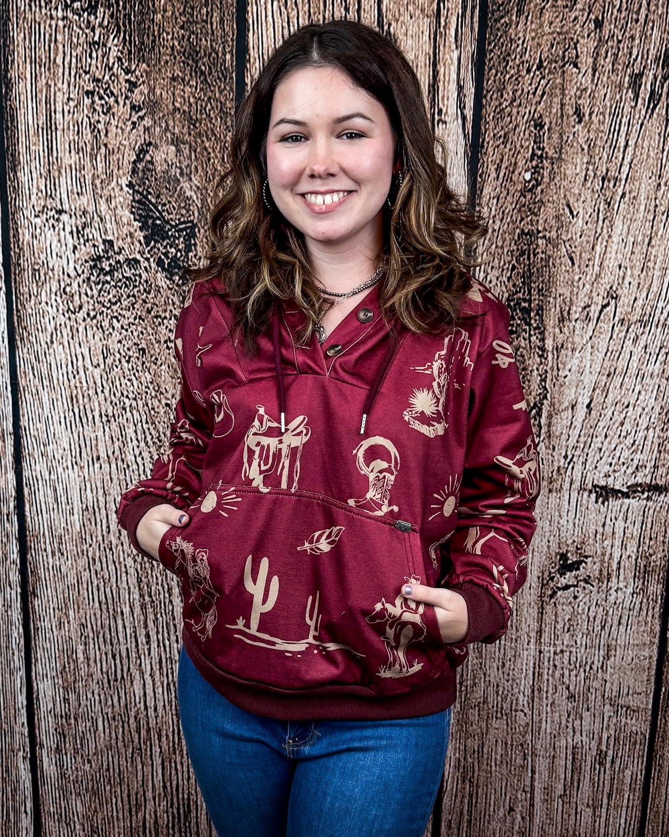 Add a dose of Western attitude to your everyday look with The Desert Rodeo Graphic Hoodie. This rich burgundy pullover is covered in classic cowboy-inspired graphics — from saddles and steer heads to desert cacti and feathers — capturing the rugged spirit of the Southwest in every detail.