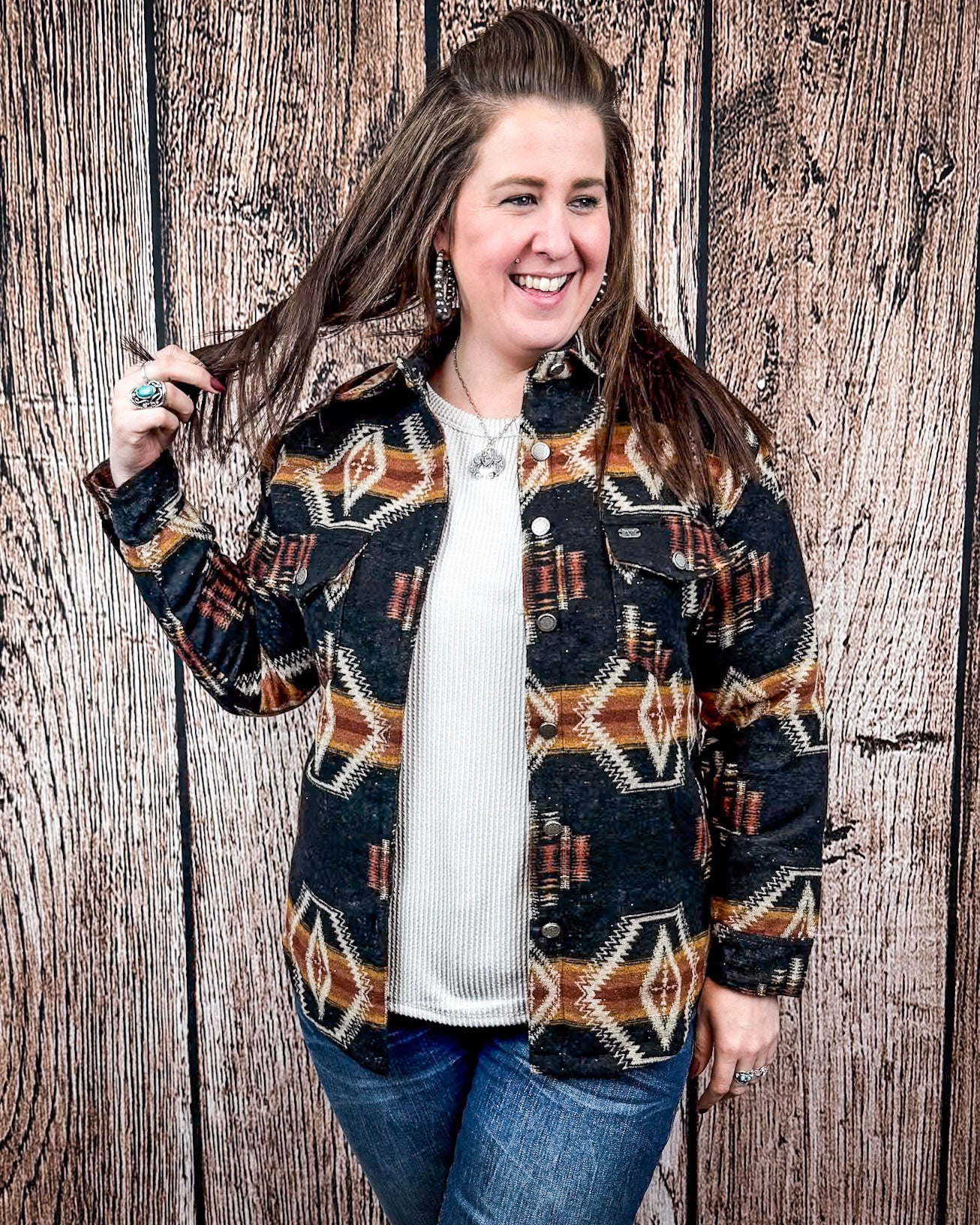 Cozy up in timeless western style with The Arroyo Aztec Button Down Shacket. Featuring a bold mix of black, rust, beige, and cream, this shacket brings effortless warmth and personality to your wardrobe.