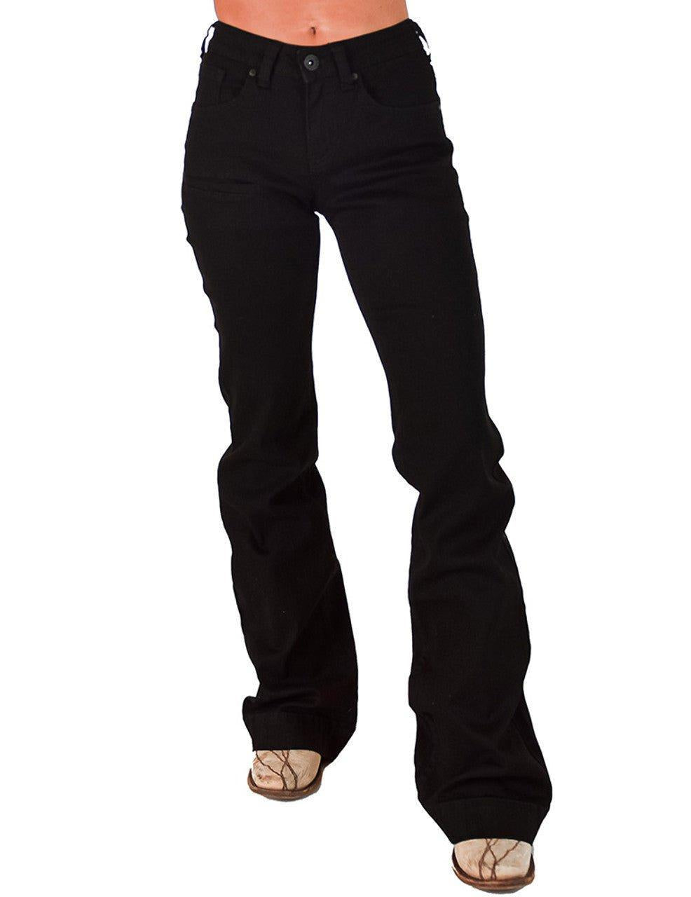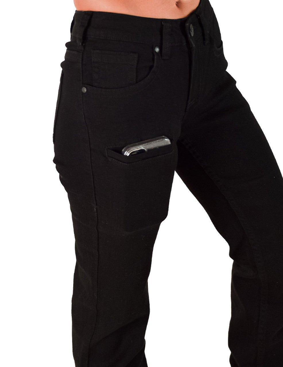Designed with a clean, solid black finish, these jeans give you a polished look with no distressing — ideal for pairing with dressy tops, blazers, or everyday Western wear. The bootcut trouser leg delivers a flattering silhouette that fits easily over boots, and the right thigh cellphone pocket keeps your essentials within reach.