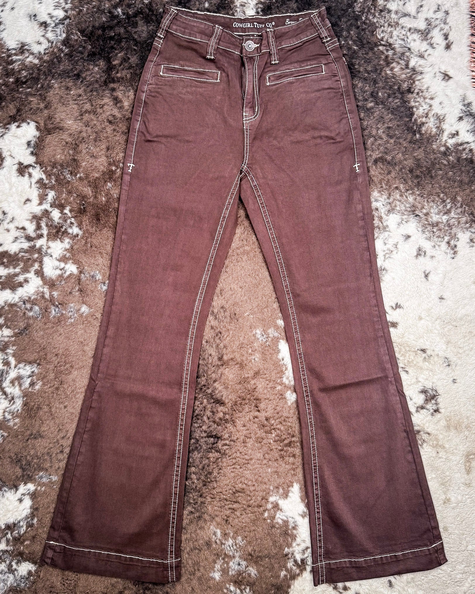 The deep brown wash pairs beautifully with the cream bootstitch embroidery for a standout contrast that’s both modern and timeless. Finished with a big cuff hem for a classy, tailored look, these trousers deliver that perfect balance of comfort and style that Cowgirl Tuff is known for.