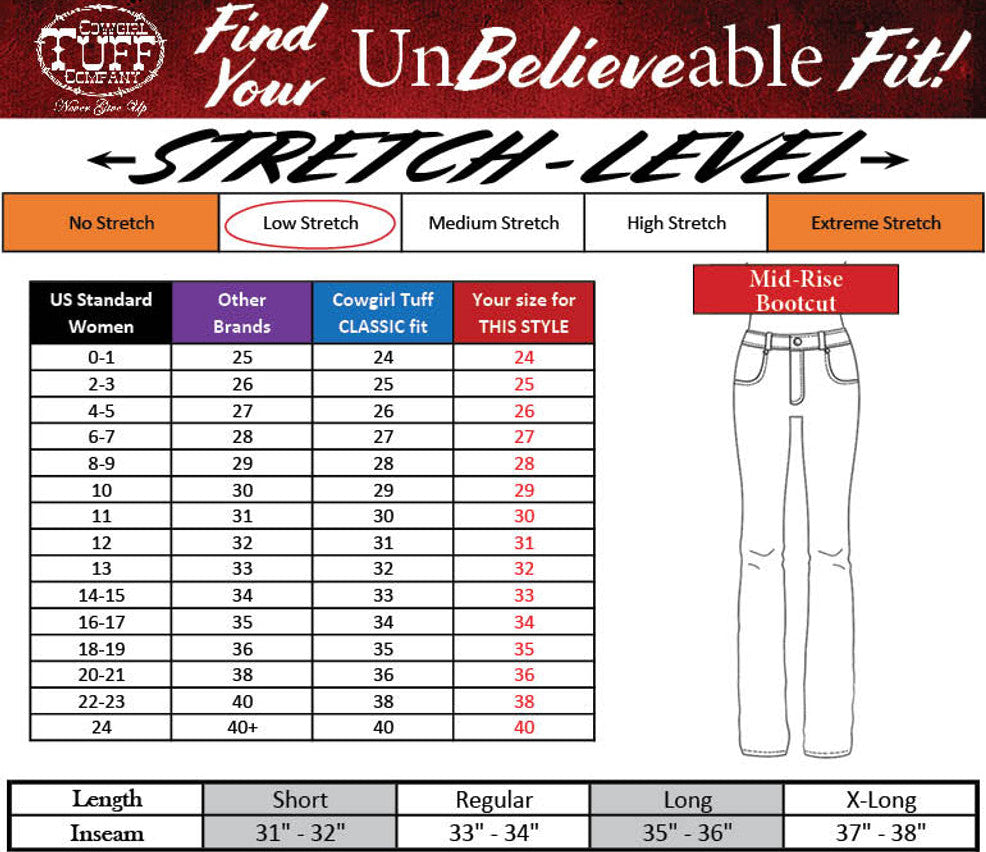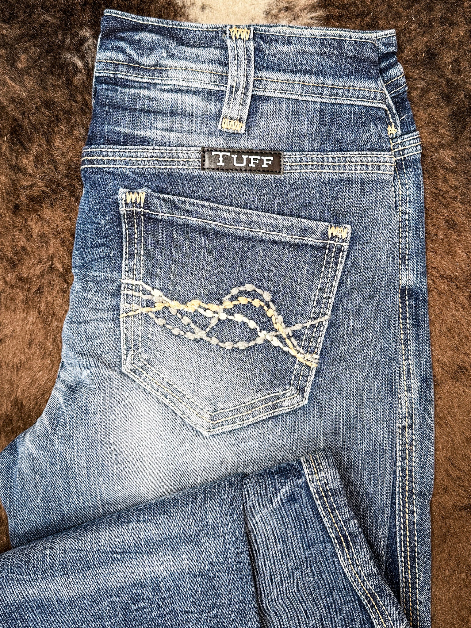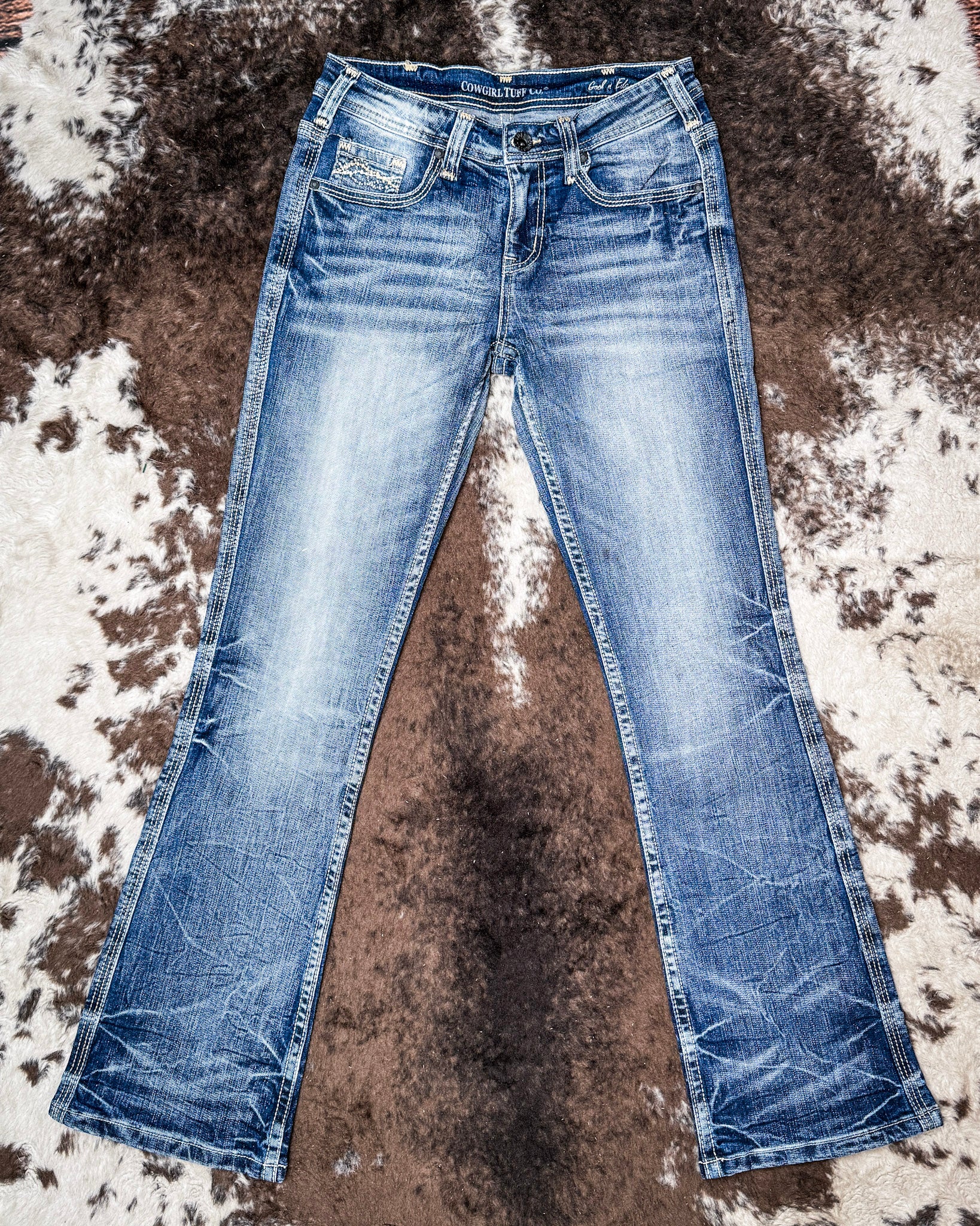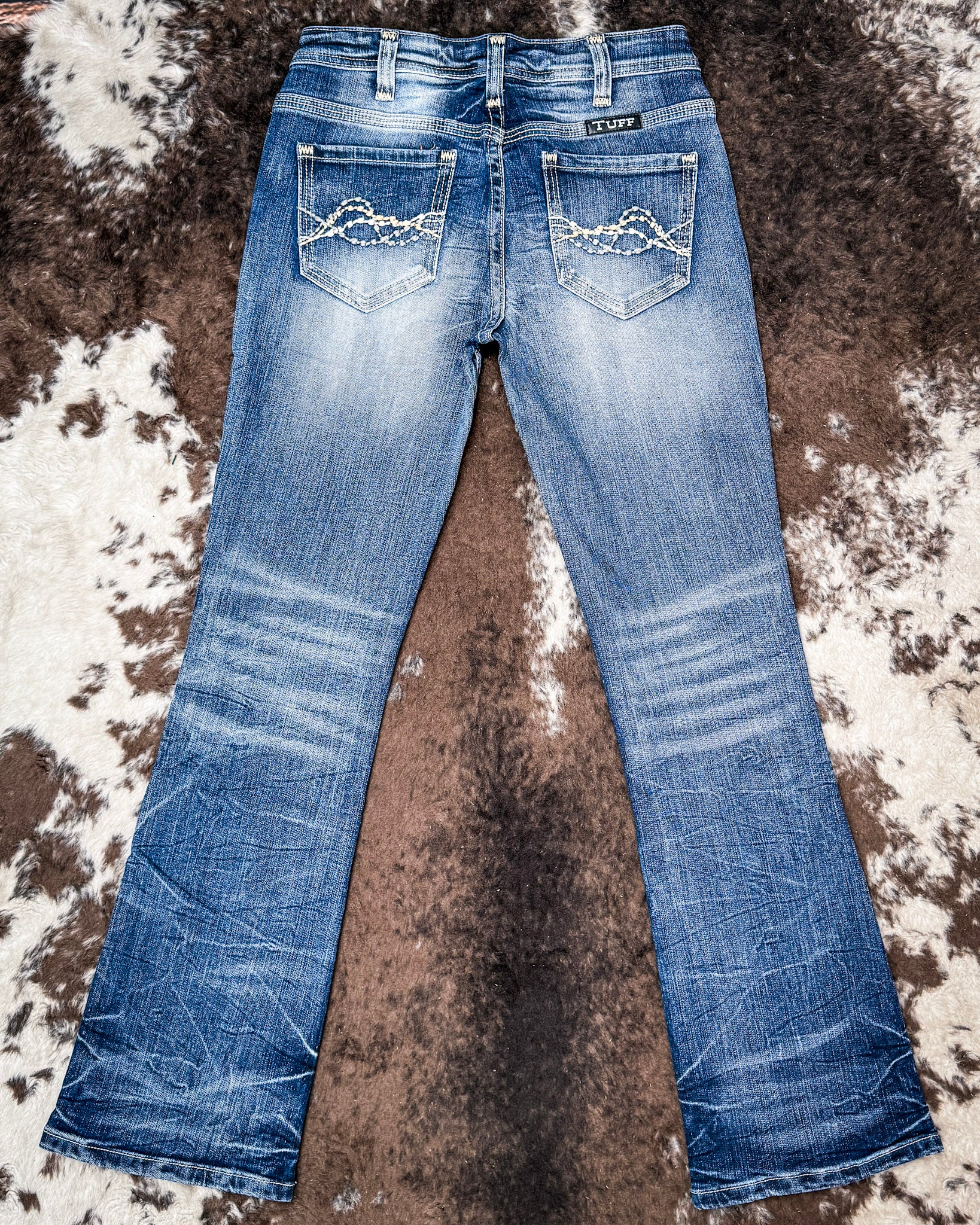 Detailed with cream, tan, and gray triple-stitching, these jeans hold up beautifully to long days in the saddle, the arena, or on the go. The low-stretch cotton blend stays true to Cowgirl Tuff’s legendary durability and classic structure, offering a snug yet comfortable mid-rise fit that flatters in all the right places. Finished with wave-stitched back pockets and subtle contrast details, they bring together the perfect mix of style and function.