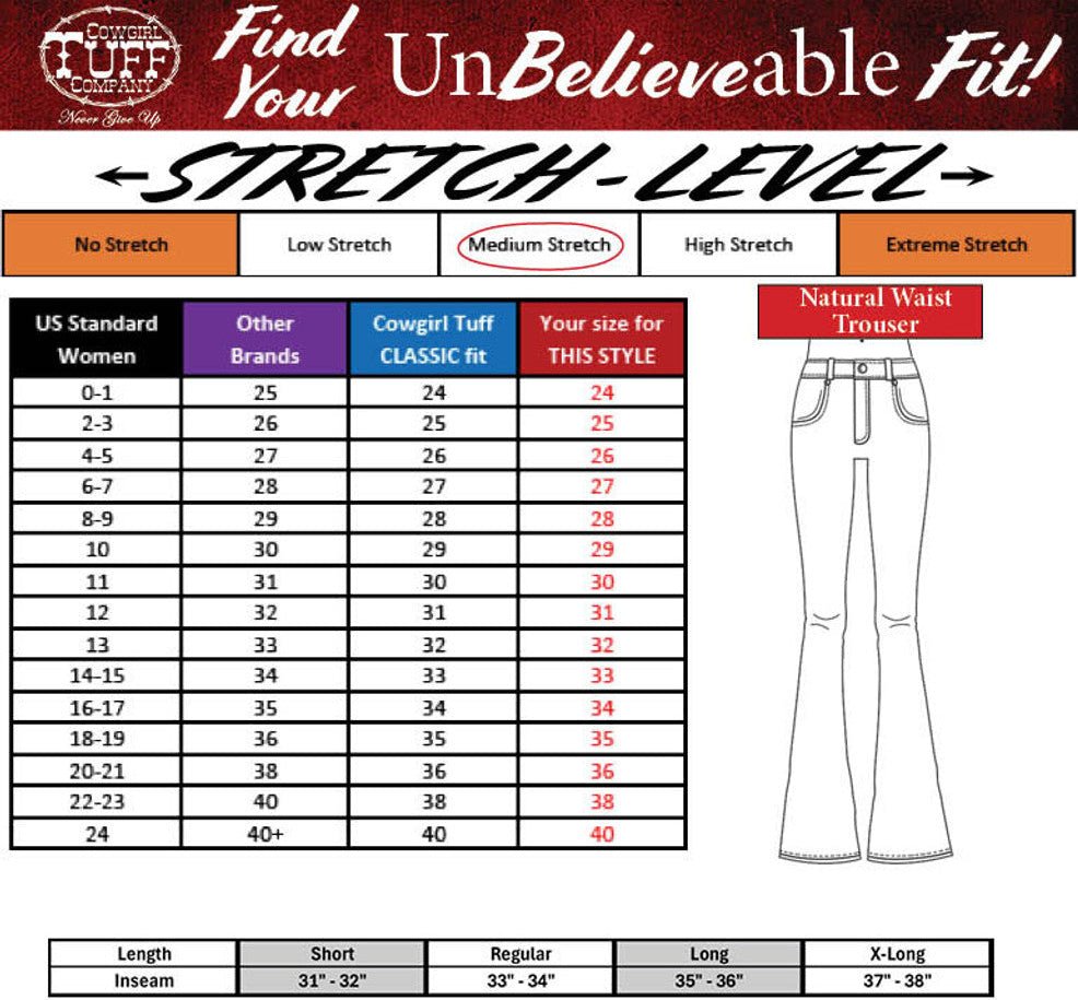 Fit Tip: Every Cowgirl Tuff style fits a little different—and that’s exactly why we include a specific size chart for each style right here on the page. Be sure to check it out before you add to your cart so you can snag the perfect fit the first time.