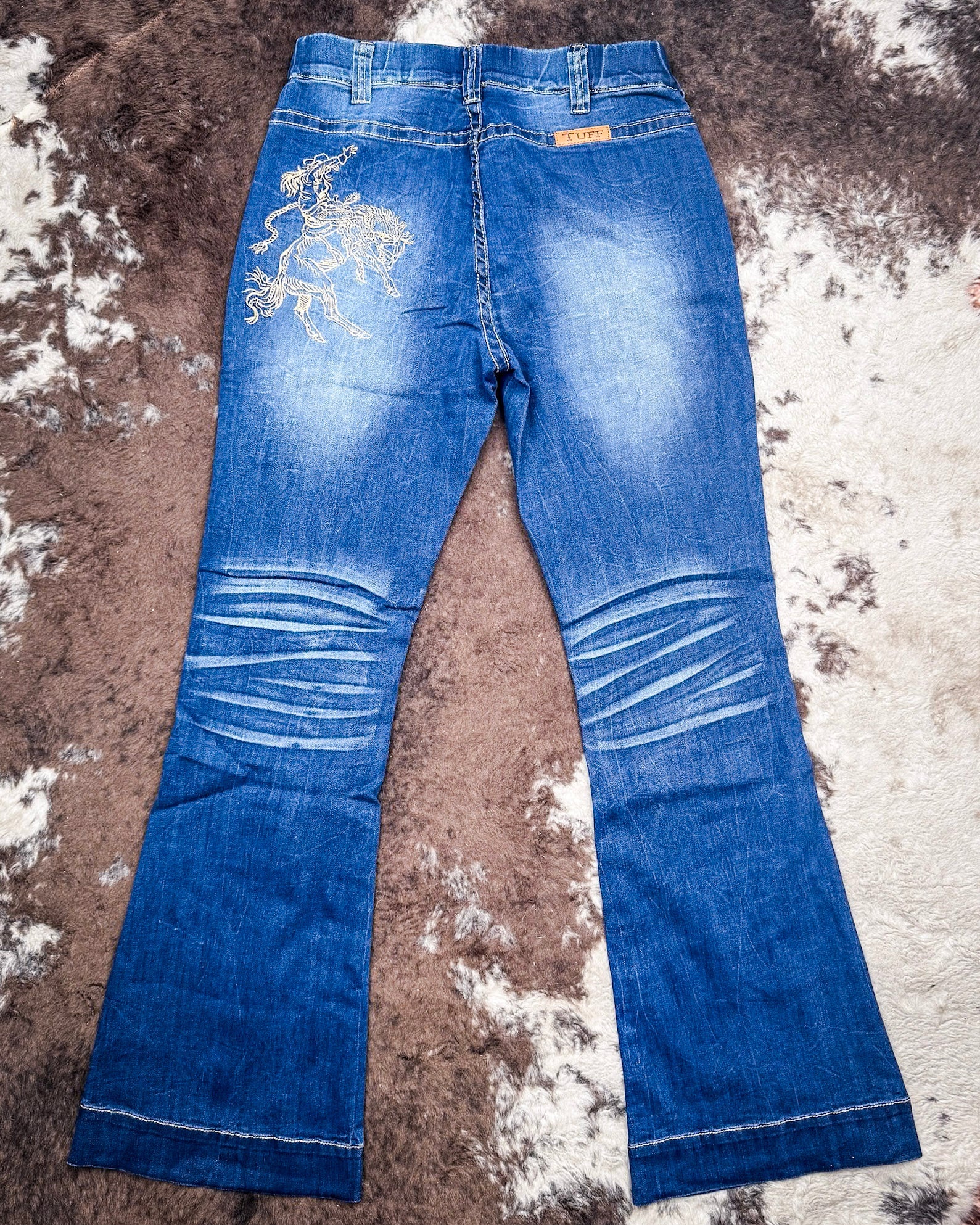 Ride bold and stay comfortable in the Cowgirl Tuff Pull-On Buck’n Bronc Trouser Jeans, a fresh new style that blends rugged Western spirit with everyday ease. These pull-on trousers feature a detailed tan bucking bronc embroidery on the left hip — a nod to true rodeo heritage.