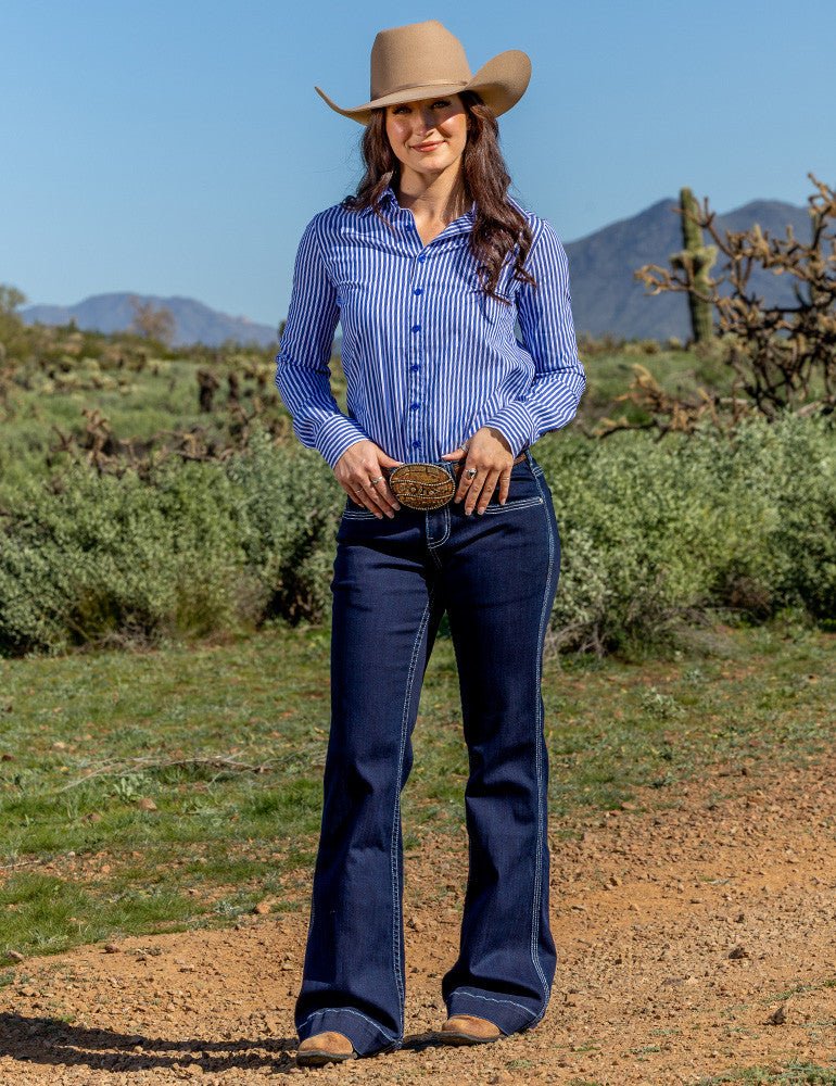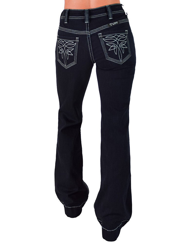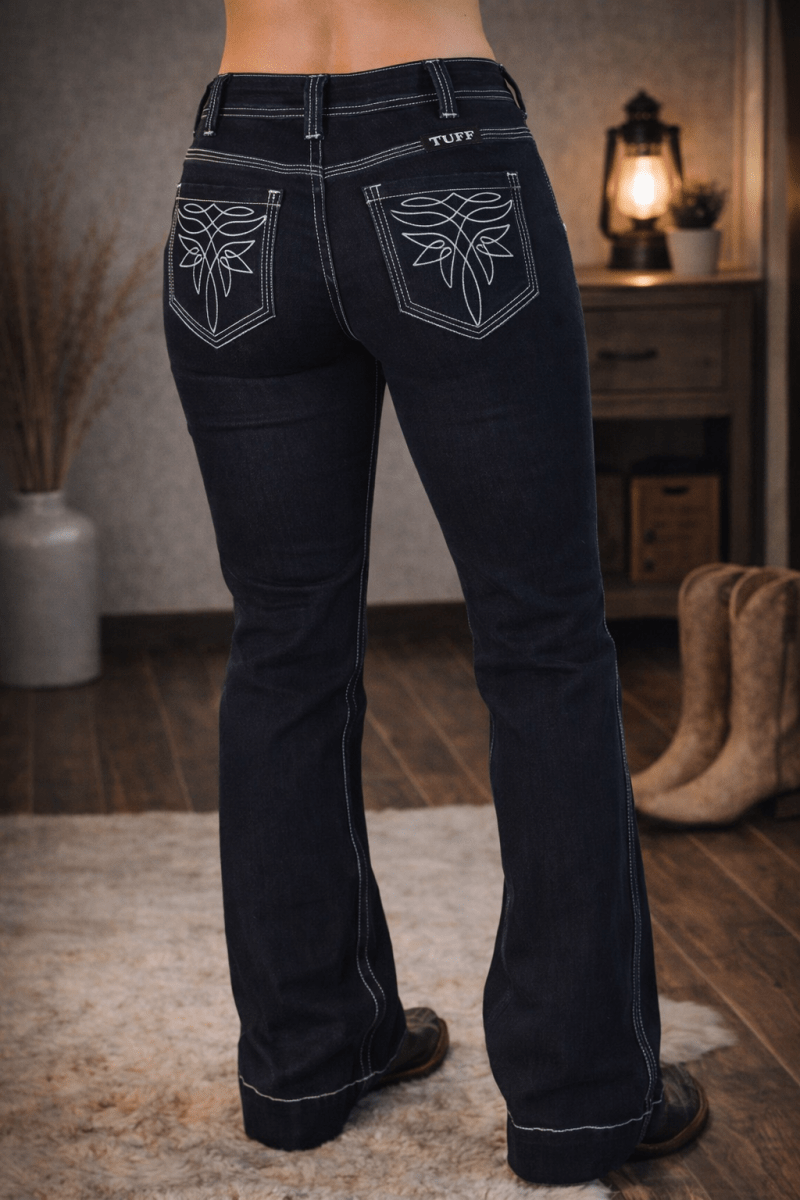 If you're looking for a polished dark wash trouser with standout detail, the Swirl Boot Stitch Trouser Jeans by Cowgirl Tuff deliver the perfect mix of classic and eye-catching. Designed with a flattering natural waist and crafted from premium Tuff Flex denim, these jeans offer medium stretch that moves with you while maintaining their shape throughout the day.