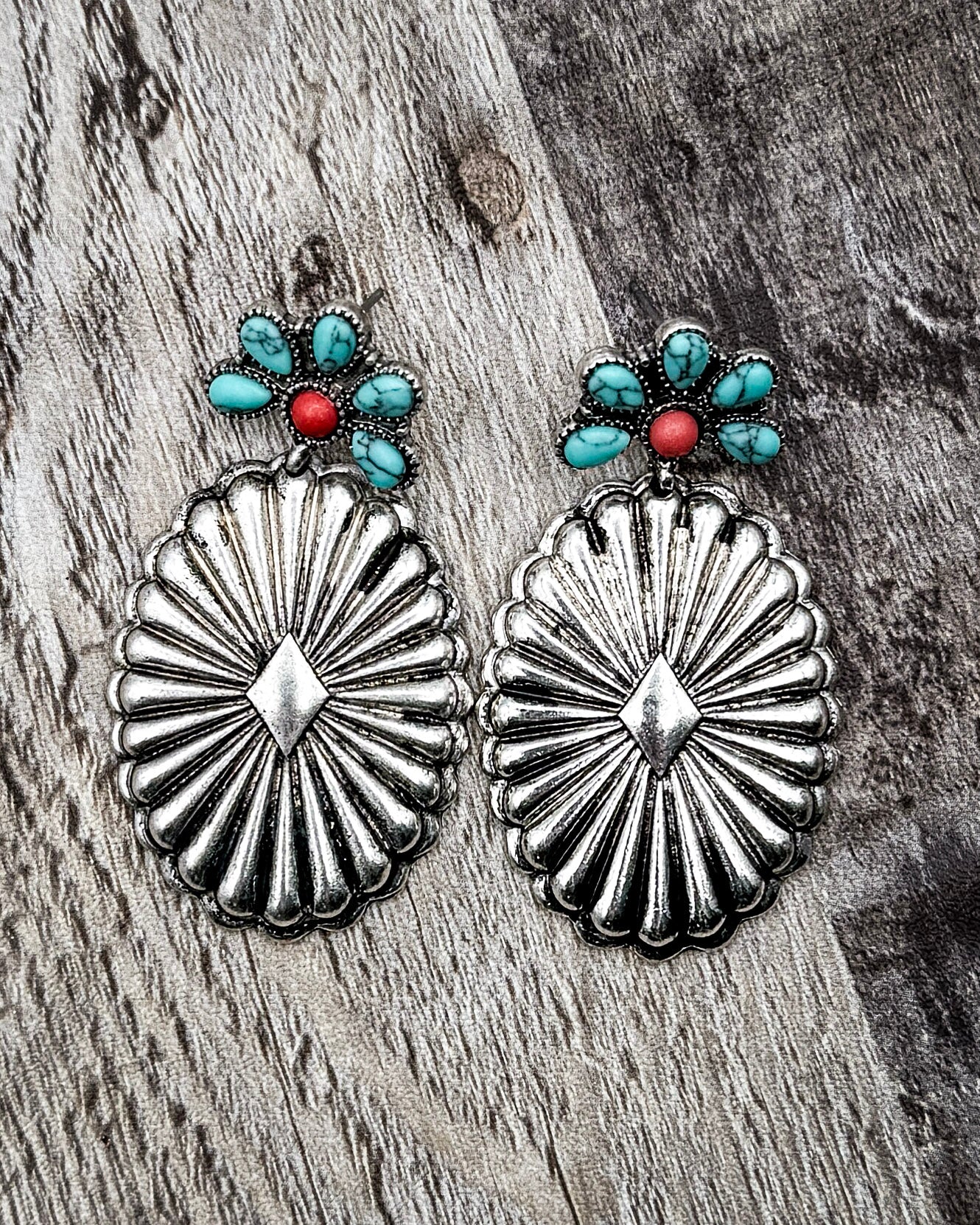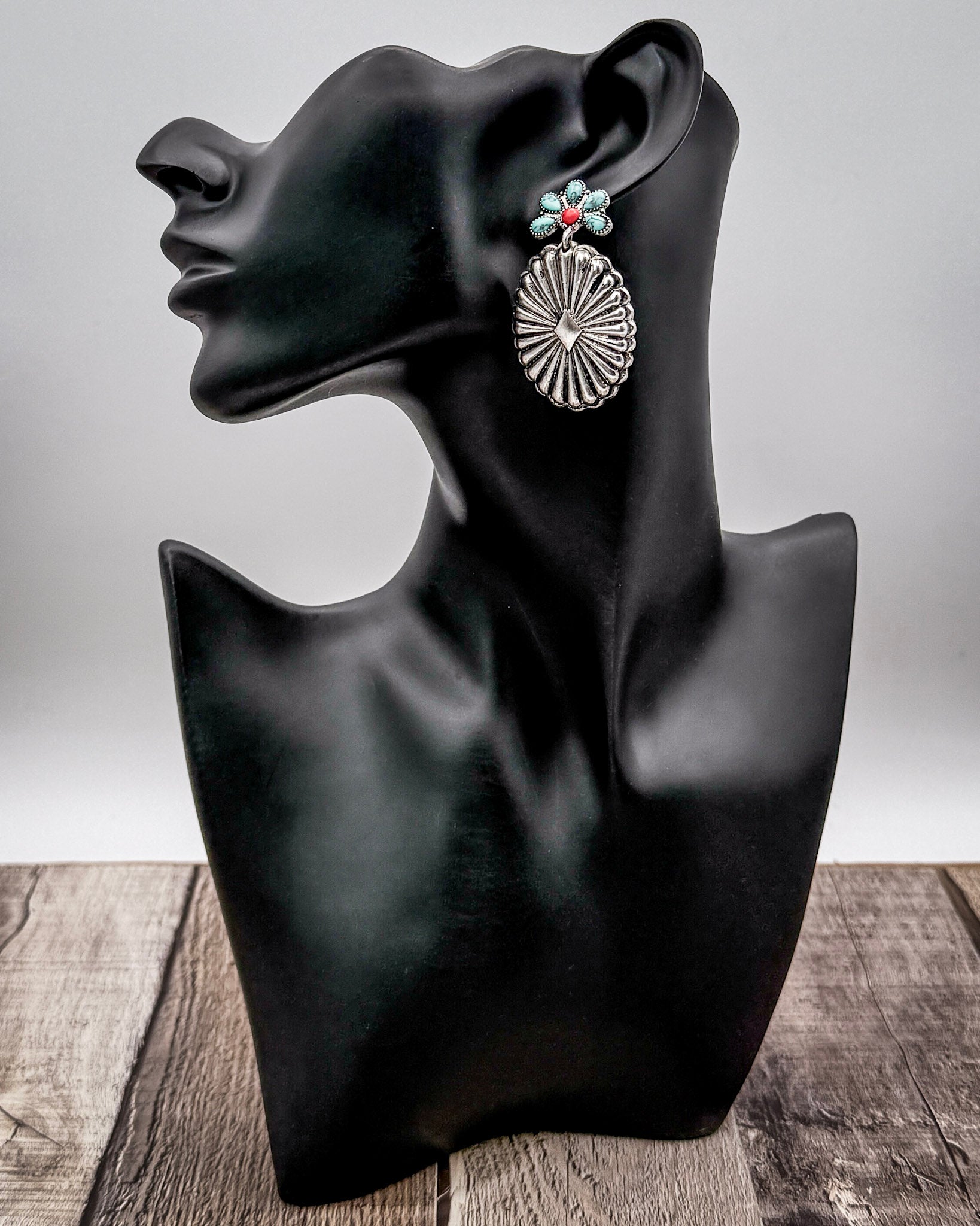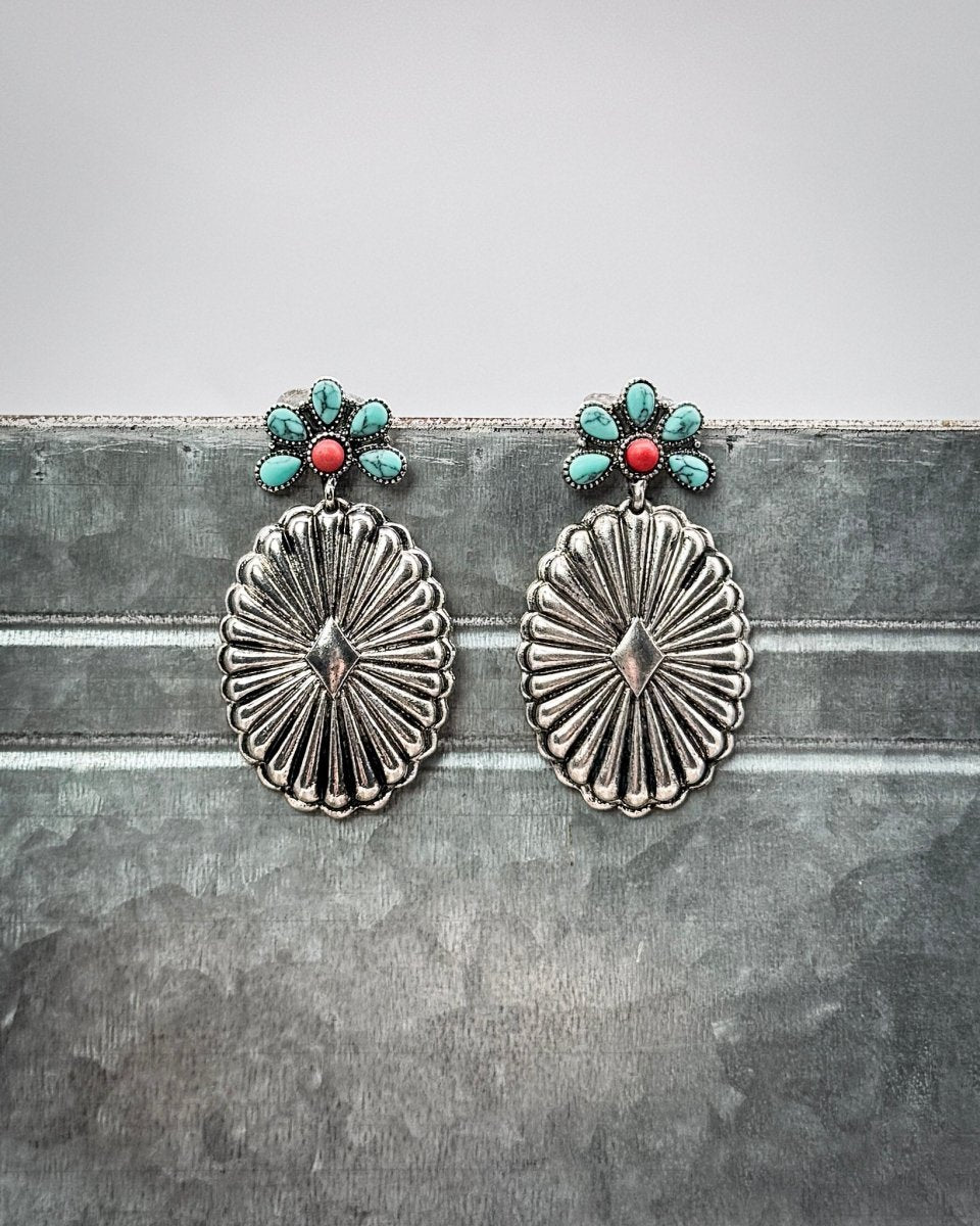 Avaline brings a fresh pop of color to a classic concho silhouette, blending bright stones with a softly burnished silver finish. These drop earrings feature a detailed oval concho paired with a floral cluster stud made of turquoise-style and coral-inspired stones. The combination creates a balanced look—eye-catching but still wearable—making Avaline an easy choice for adding interest to everyday outfits or completing a styled-up look.