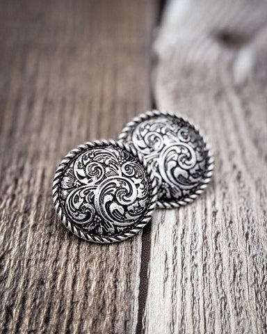 Embrace timeless western charm with the Ellie Western Rope Filigree Stud Earrings. Featuring intricate floral scrollwork framed by a classic rope border, these silver-tone conchos are the perfect everyday accessory for the modern cowgirl. Their subtle shine and detailed craftsmanship make them an effortless match with denim, boots, and turquoise layers — a must-have for any western jewelry collection.