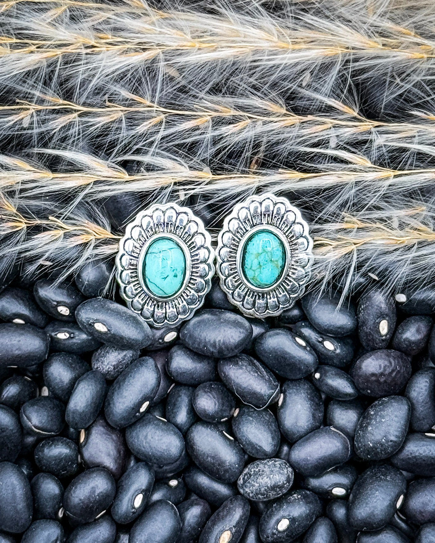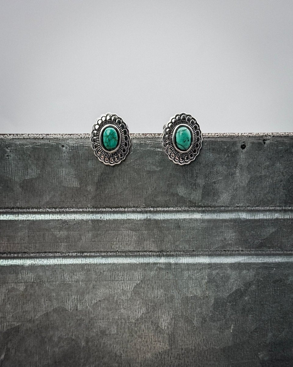 Elmora offers a clean, polished stud design with just the right amount of detail for everyday wear. These petite burnished silver earrings feature a softly stamped floral-inspired border that frames a smooth faux turquoise center, creating a subtle texture that remains modern and easy to style. Their small size makes them an effortless choice for daily outfits, whether you're heading to work, running errands, or dressing up a simple tee and denim.