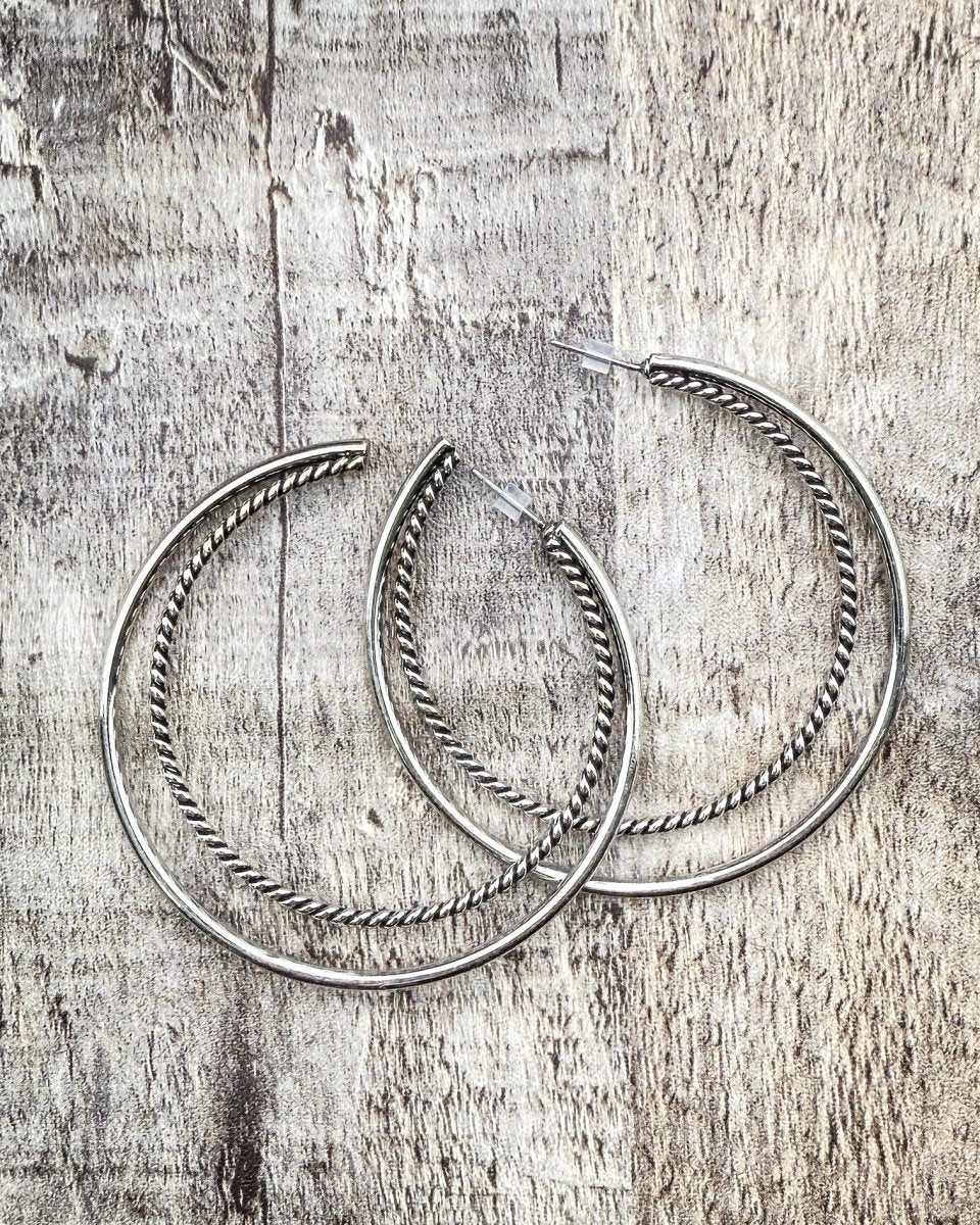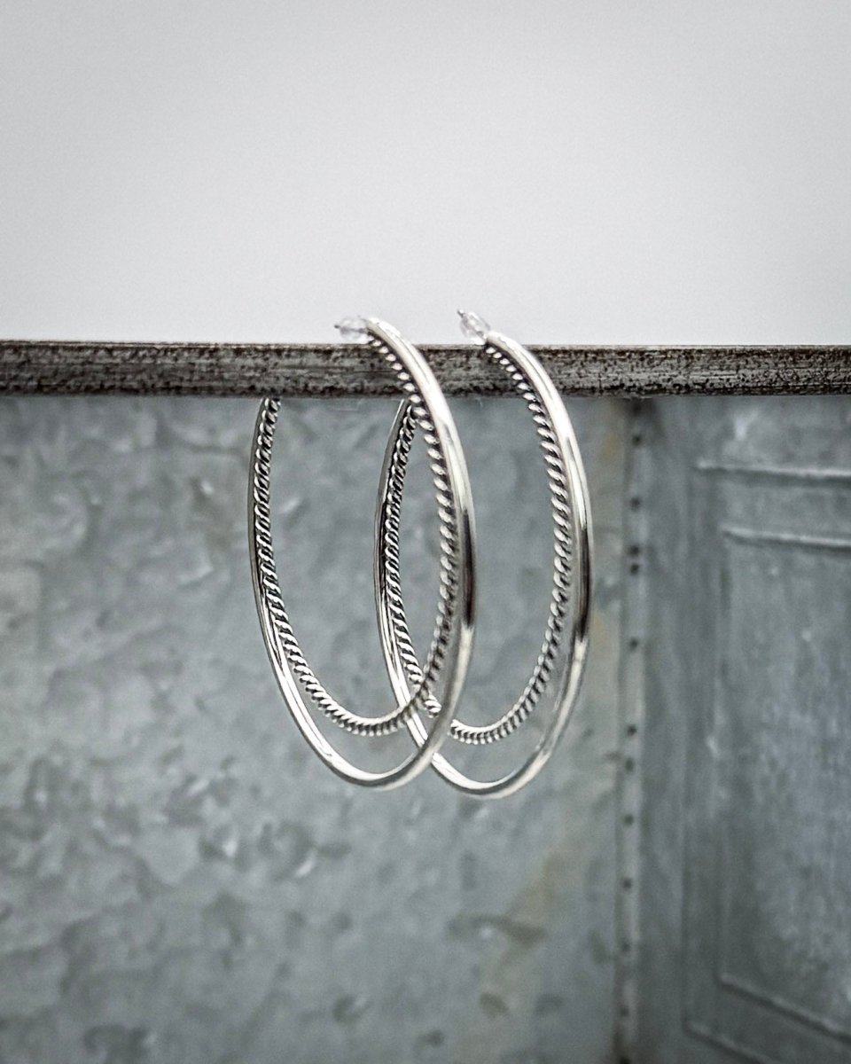 Frostline delivers a sleek, modern twist on a timeless silhouette with these beautifully crafted 18K white gold plated double hoop earrings. Measuring a bold yet wearable 2.25 inches, this design features two parallel hoops—one polished and smooth, the other detailed with a rope-inspired texture that adds subtle dimension. The result is a clean, elevated look that stands out without overwhelming your style.