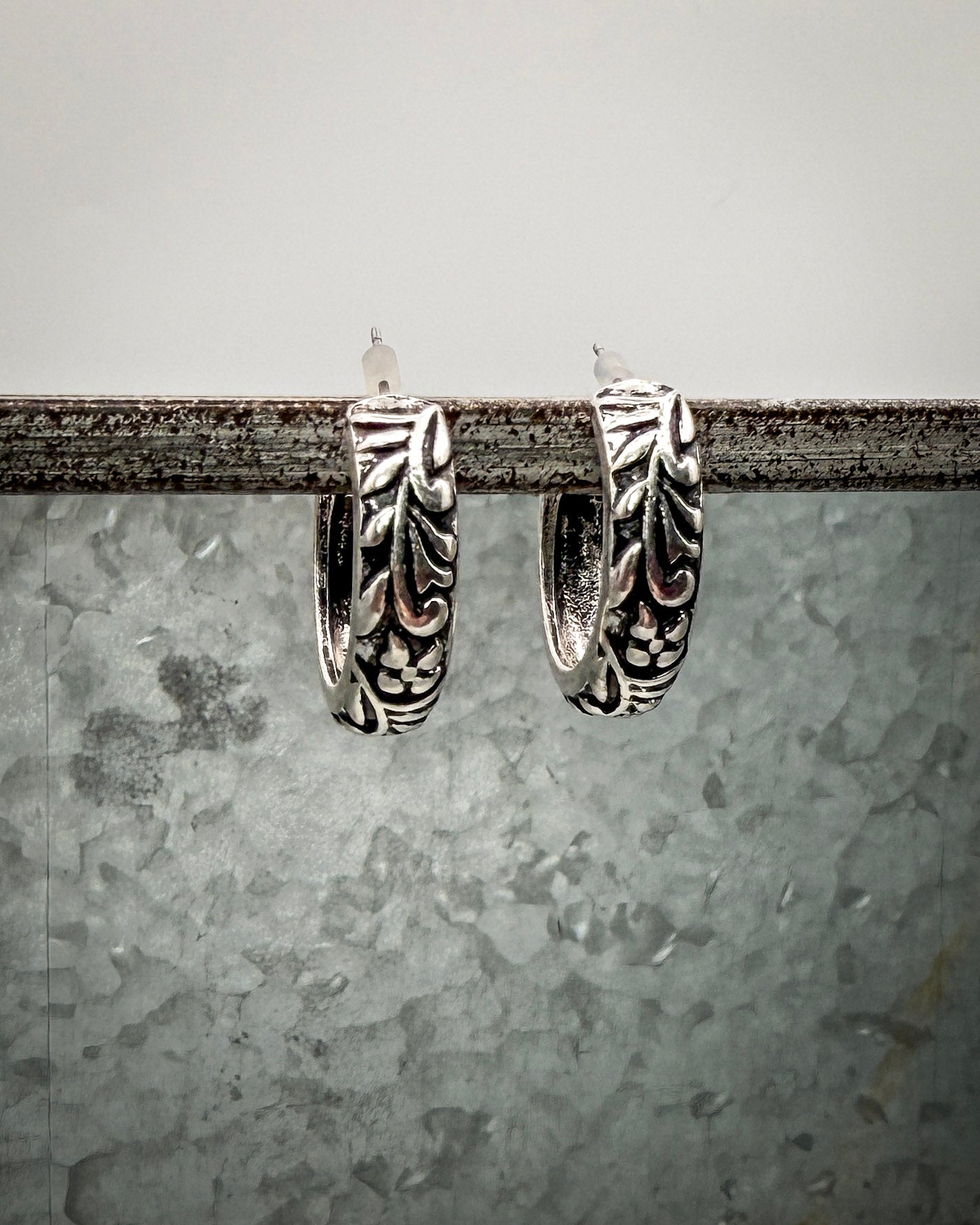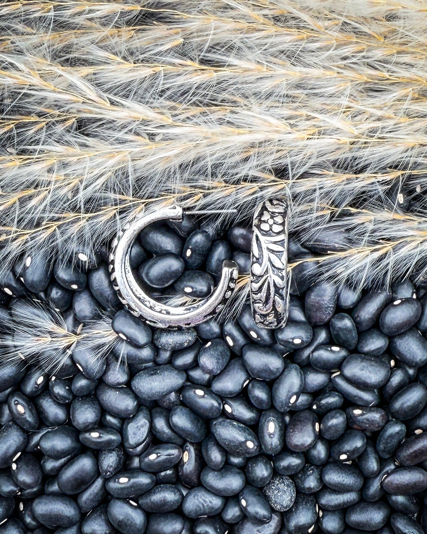 Lightweight and comfortable, the Sable hoops pair easily with both casual staples and more polished outfits, making them a versatile accessory you’ll reach for again and again. The burnished silver finish adds dimension and depth, highlighting the engraved design with a softly antiqued touch.