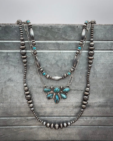 Featuring three layered strands with a faux turquoise floral pendant centerpiece, theΒ Sagebrush Skies is perfect for pairing with a graphic tee, flowy dress, or your favorite denim jacket. Whether youβre headed to a rodeo, concert, or a night out, this statement necklace completes your look with effortless cowgirl grace.