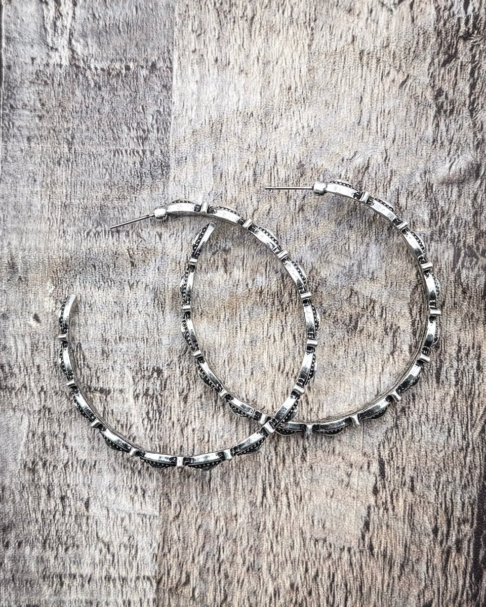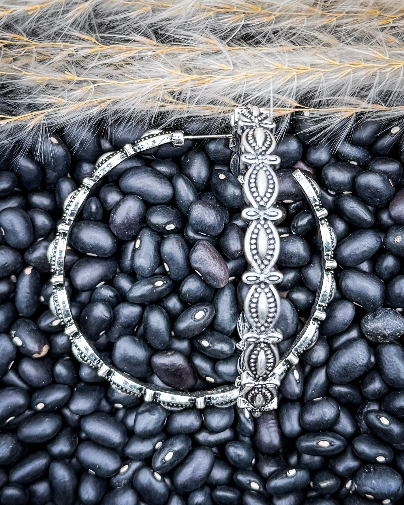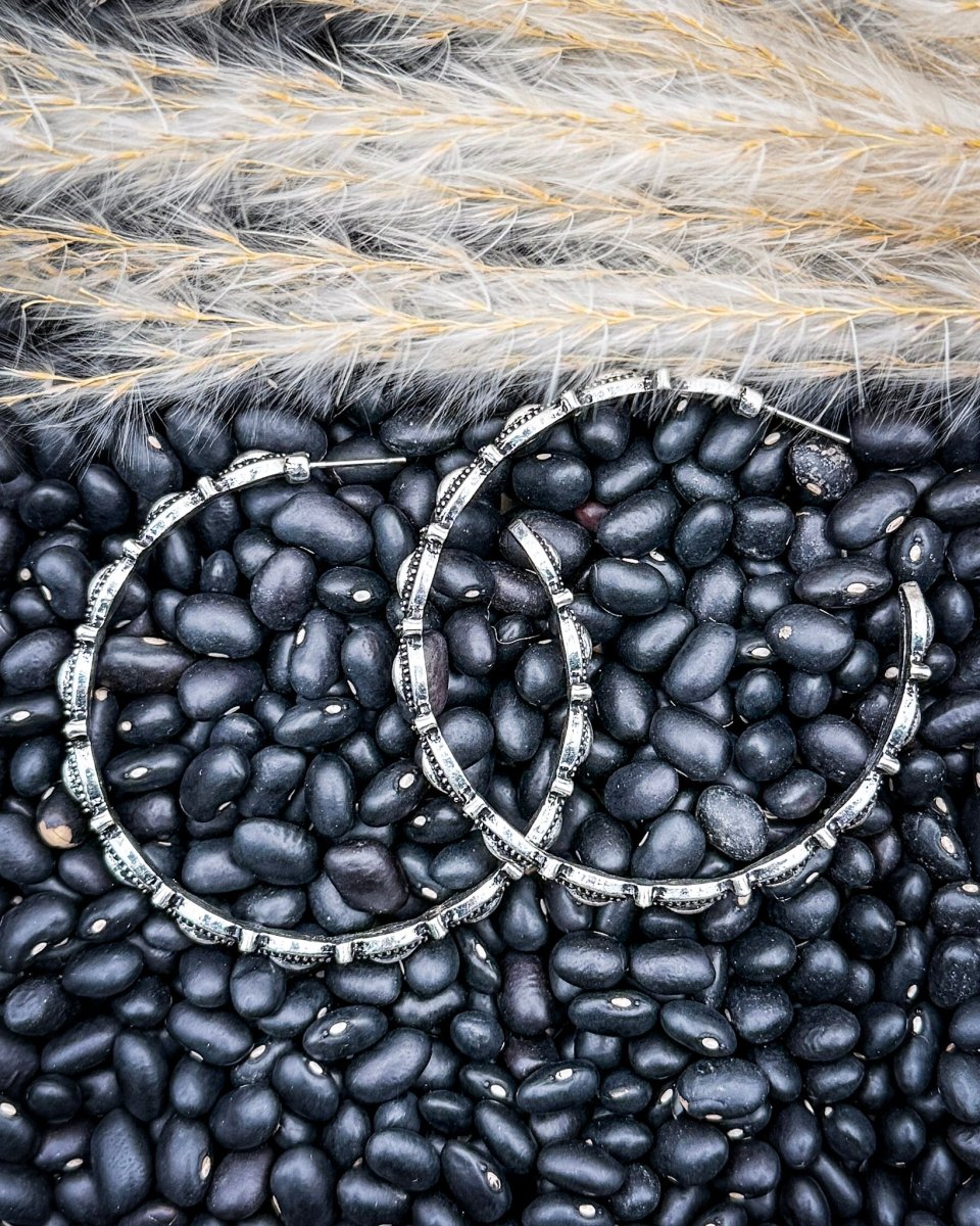 Silver Rowan brings a refined, sculpted look to your jewelry rotation with beautifully detailed burnished silver scalloped hoops. At a bold yet wearable 2 inch size, these earrings strike the perfect balance between standout style and everyday versatility. Each hoop features an ornate repeating pattern with soft antiquing that highlights the carved design, giving the pair a dimensional, handcrafted feel without leaning overly western or embellished.