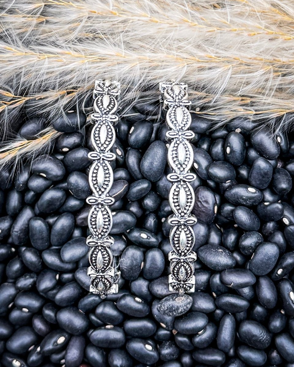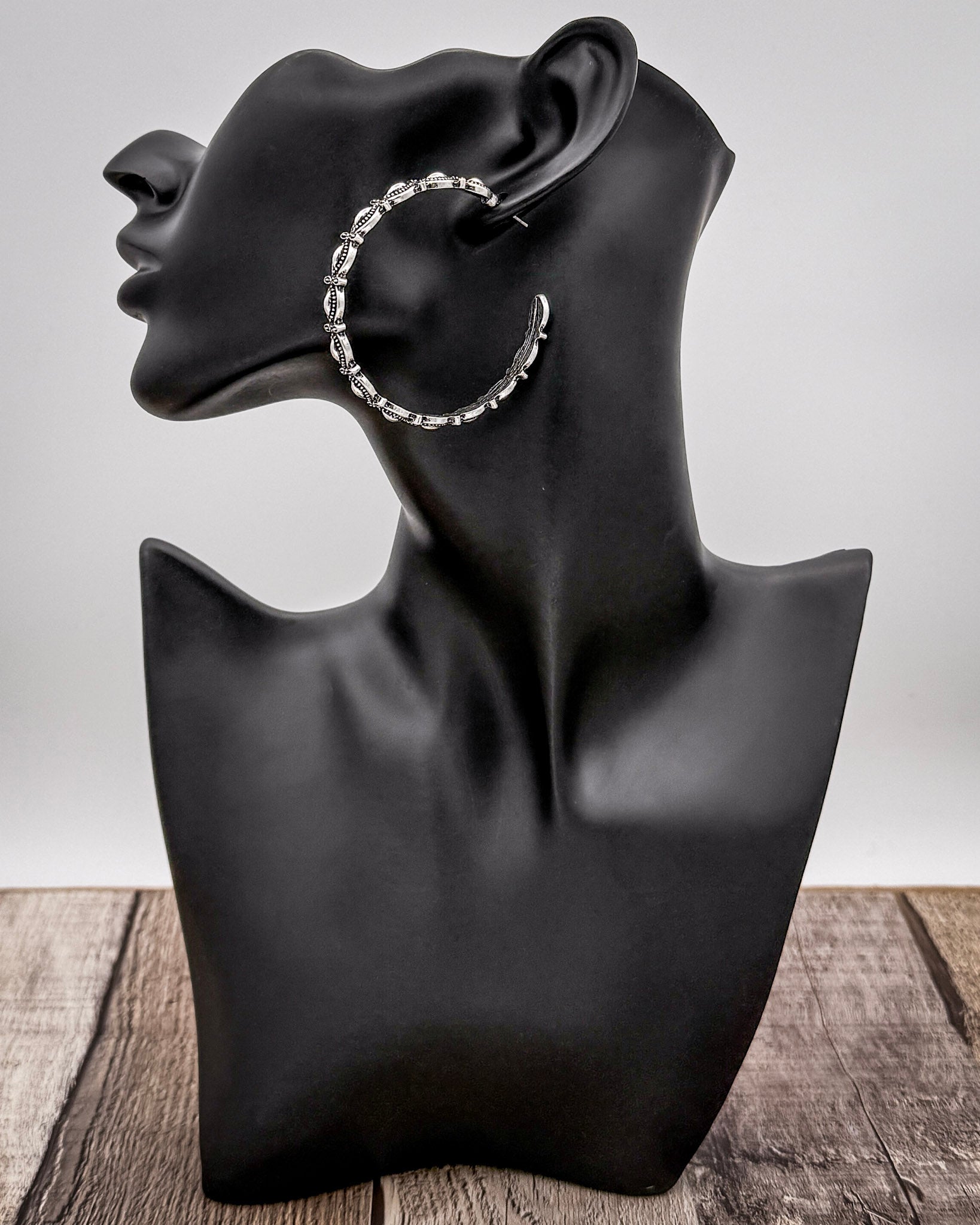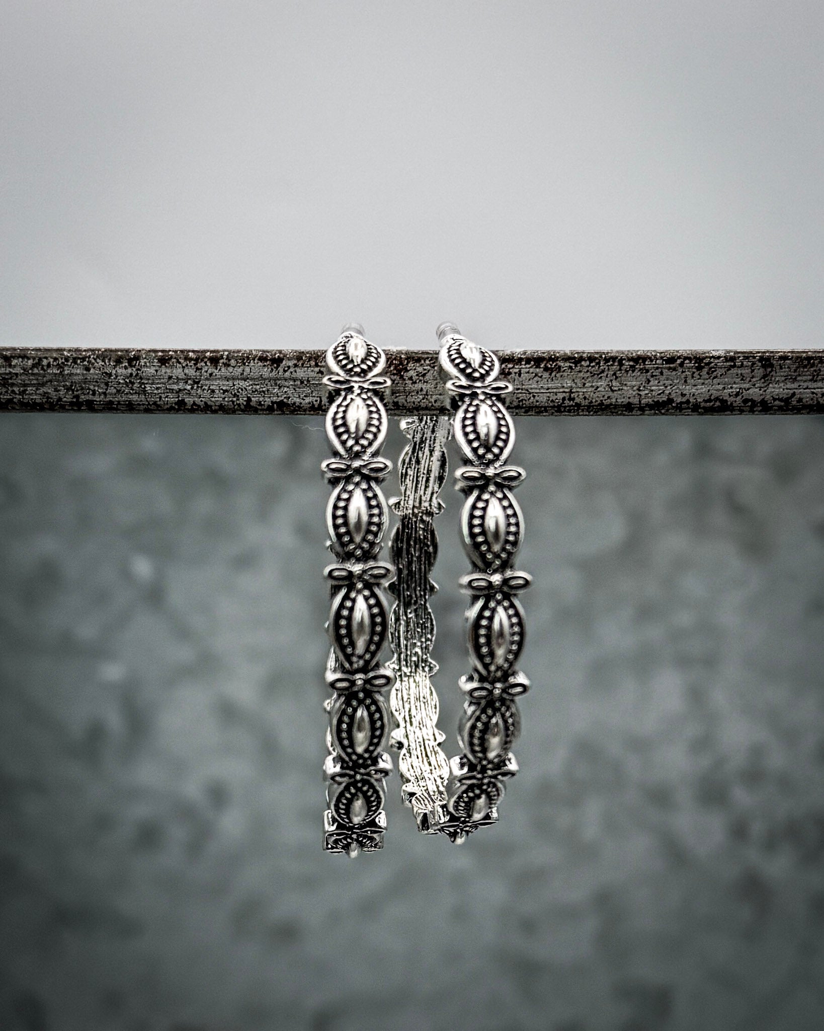 Silver Rowan brings a refined, sculpted look to your jewelry rotation with beautifully detailed burnished silver scalloped hoops. At a bold yet wearable 2 inch size, these earrings strike the perfect balance between standout style and everyday versatility. Each hoop features an ornate repeating pattern with soft antiquing that highlights the carved design, giving the pair a dimensional, handcrafted feel without leaning overly western or embellished.