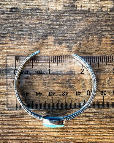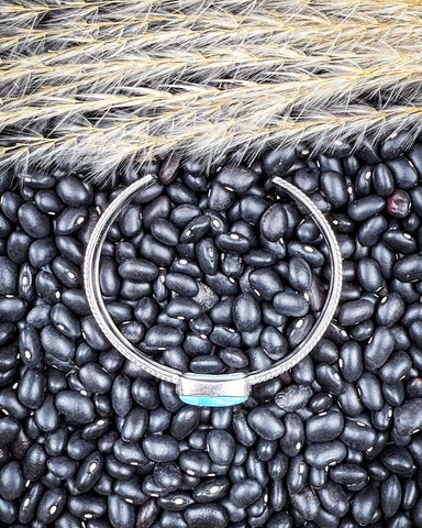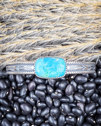 At the center of this cuff is a stunning turquoise stone, handpicked from Arizona and full of vibrant, natural character. The rich blue hues are streaked with soft variations and veining, making each stone one of a kind. It’s framed in a detailed silver bezel that balances rustic charm with refined craftsmanship.