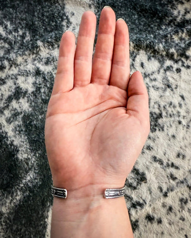 The band itself is made from high-quality 925 sterling silver and finished with a slightly oxidized patina that highlights every ridge, line, and stamp. The shape is a gently curved open cuff, designed to rest comfortably around the wrist while staying secure throughout your day. At 60mm x 50mm, it fits most wrists and can be gently adjusted for a more personalized fit.
