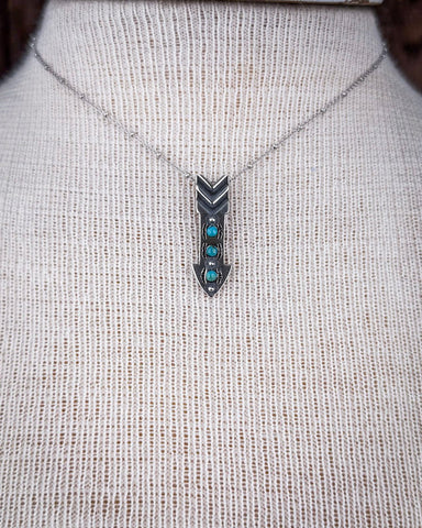 The pendant is crafted in the shape of an arrowhead, a design that’s long been worn as a symbol of strength and guidance. Clean lines and hand-stamped details give the silver a raw, organic feel—nothing polished or perfect, just real. Three small turquoise stones run down the center of the arrowhead, each one natural and unique, adding a pop of earthy color and meaning.