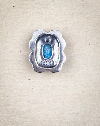 The craftsmanship shines in the details. The stamped design draws from traditional silversmith techniques, with a floral-like silhouette that feels organic yet structured. The added beaded border creates a beautiful contrast to the smooth turquoise center, giving the whole piece depth and dimension without overpowering the stone.