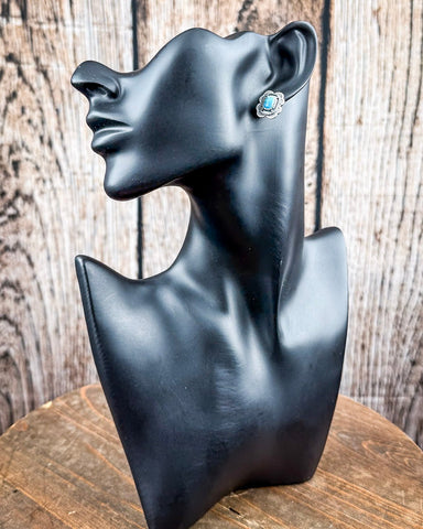At the center of each earring sits a genuine turquoise stone, hand-selected from Arizona and set in solid sterling silver. Each stone is naturally unique, with soft variations in tone and texture that make every pair one of a kind. Framing the turquoise is an ornate, stamped silver setting with rounded edges and beaded accents, giving these studs just the right amount of vintage-inspired flair.