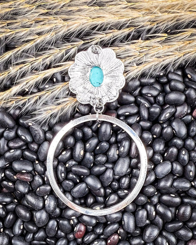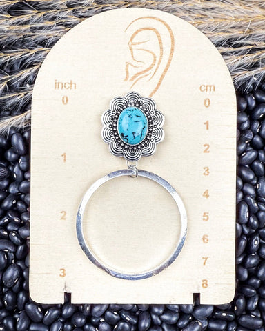 At the center of the design is a large, oval-shaped faux turquoise stone set into an intricately tooled silver concho. The setting features a floral, scalloped pattern reminiscent of traditional Western silversmithing, giving the earrings a touch of vintage charm and handcrafted character. The rich turquoise hue evokes the blue mesas and endless skies of the American Southwest. It’s a color that tells a story of horizon lines, quiet strength, and the enduring beauty of earth and sky.