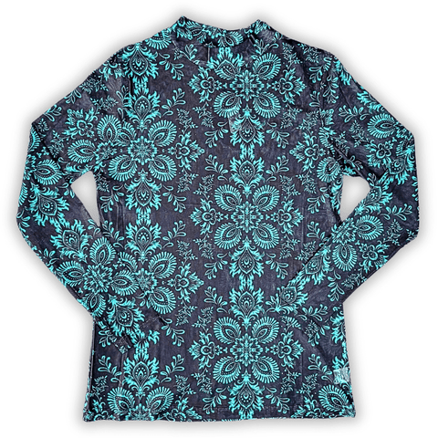 This is the ultimate piece to bring a little edge and attitude to your wardrobe. The black and teal pattern is a striking combination that feels both modern and timeless, making it easy to mix and match with your favorite wardrobe staples. Style it with distressed denim and ankle boots for a casual-cool aesthetic, or go all out with leather pants and bold accessories for a night out. If you're feeling adventurous, pair it with a mini skirt and knee-high boots for a flirty, fashion-forward look. No matter how you style it, this top is designed to keep all eyes on you.