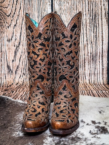 Built on a foundation of rich cowhide leather, the Bronzed Bloom brings warmth and depth from the moment you slip it on. The tone is a beautifully bronzed brown, not too dark and not too light, making it easy to pair with just about everything in your closet. But what really makes this boot stand out is the floral overlay design—cut by hand, layered with care, and stitched with precision. Black sequin inlays peek through the flowers, adding a subtle shimmer that catches the light just right. It’s bold without being loud. Feminine without feeling frilly. And entirely unforgettable.