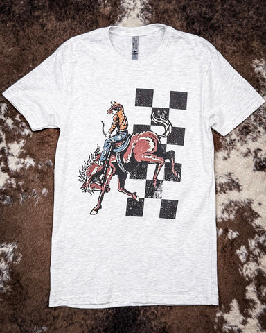 The standout graphic features a vintage-style bronc rider mid-buck, done in rustic tones of red, denim blue, tan, and white. Behind the rider is a distressed black checkerboard pattern that gives the whole design a punchy, modern twist. It’s bold, a little retro, and 100% rooted in western culture.