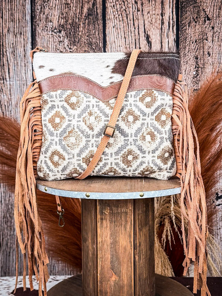 Accented with genuine leather, the top of the bag curves gently in a V-shape—like a soft mountain ridge or the silhouette of a saddle. It’s trimmed with hair-on-hide, which adds a touch of organic luxury. But here’s the thing: no two hides are alike. So while yours may look a little different than the one pictured, that’s the magic. Each piece is a one-of-a-kind treasure, with natural variations in color and pattern that make it uniquely yours. We don’t guarantee what hide you’ll get, but we can promise it’ll be beautiful.