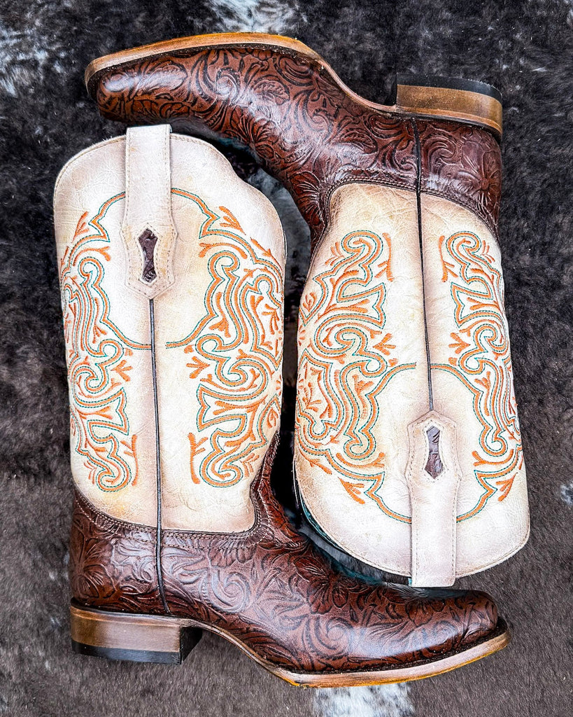 What sets these boots apart is the intricate teal and orange embroidery that flows across the shaft like soft lace draped over rugged stone. The stitching forms delicate patterns that feel both feminine and fiercely Western, creating a striking contrast against the warm leather backdrop. It’s a design that brings a soft elegance to a boot built for the toughest rides and longest days.