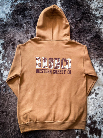 Wrap yourself in our rugged, western-inspired Cattle Hoodie this season! Designed for both men and women, this unisex hoodie embodies the true spirit of the West. It features a unique white and brown cow print graphic on the back that is guaranteed to make you stand out. Manufactured from a premium blend of cotton and polyester, our hoodie is not only comfortable but also sturdy. Its golden pecan color further adds to its rustic appeal.