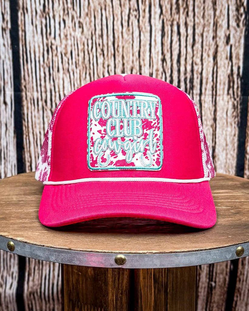 The front features a colorful patch that reads "Country Club Cowgirl" in turquoise and hot pink—a little cheeky, a little classic, and totally on trend. It's stitched onto a seamless, foam-front crown with a soft cotton lining on the inside, so it holds its shape but still feels comfy from sunup to sundown. This is one of those hats that’s not just about looking good—it’s made to be worn, lived in, and loved.