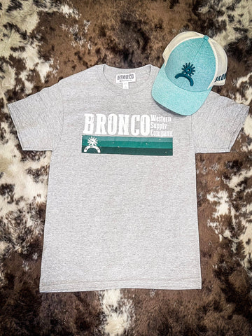 The Current Tee by Bronco Western Supply Co. is a stylish and versatile unisex t-shirt in a heathered grey color. Featuring bold teal and dark turquoise accents, this tee adds a pop of color while maintaining a classic, laid-back look. Perfect for everyday wear, its soft, comfortable fabric offers a relaxed fit that suits any casual occasion. Whether you're out on the ranch or hanging with friends, the Current Tee blends western charm with modern style.