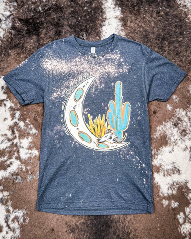 The front graphic features a crescent moon, a bright desert bloom, a saguaro cactus, and a longhorn skull—all set against a charcoal black base with hand-bleached accents. The words “Desert Child” arch along the top, adding that little extra touch of wanderlust. Whether you're drawn to desert landscapes or just love a bold graphic with western roots, this tee brings that energy front and center.
