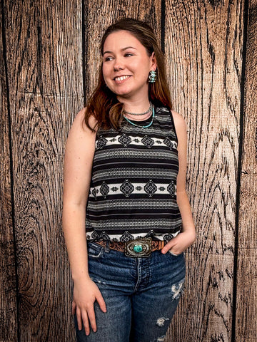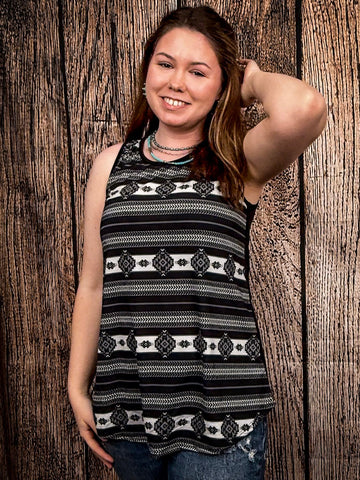 Meet your new summer go-to: the Dust on the Horizon Tank. This black-and-white beauty brings that effortless southwestern edge to your everyday closet—cool, comfy, and full of quiet style. With bold Aztec-inspired stripes and a flattering swingy silhouette, this tank is made to move with you from early chores to golden hour drinks on the porch.