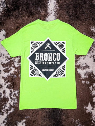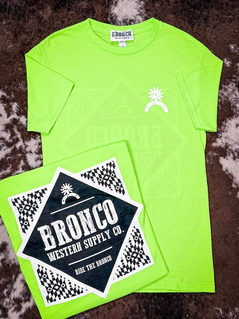 You know we don’t do plain tees around here. Up front, you’ve got our classic Spur Up logo—small, clean, and iconic. Flip it around and boom: our oversized Bronco Western Supply Co. graphic framed in that signature geometric, bandana-style pattern. It's a bold nod to the west with a modern edge—just like you.