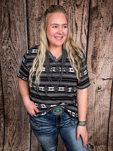 There’s something about a good Aztec print that never goes out of style—and the Krista Black Aztec Print V-Neck Top by Lucky & Blessed proves it. Designed for the wild-hearted woman who walks the line between classic western grit and effortless modern style, this top is the kind of staple you’ll find yourself reaching for day after day.