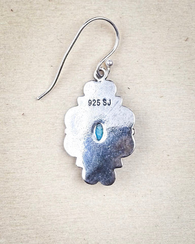 Each earring is handcrafted from solid 925 sterling silver and marked with the “925” and “SJ” stamp as a symbol of its authenticity and artisan quality. The design centers around a diamond-shaped silver frame, layered with intricate stamping and engraving that radiates outward in a sunburst pattern. The craftsmanship speaks for itself—clean lines, soft curves, and attention to every small detail.