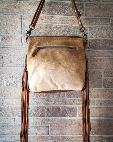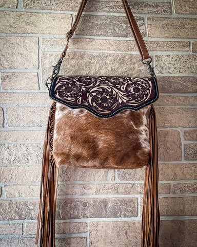 Let’s start with that flap. Hand-tooled leather blooms with swirling floral designs—each petal, curve, and line carved with care. It’s bold and intricate without feelin’ fussy, the kind of craftsmanship you can feel in your hands. Below, soft hair-on-hide in earthy brown tones adds warmth and contrast, bringing an organic touch to the structured silhouette.